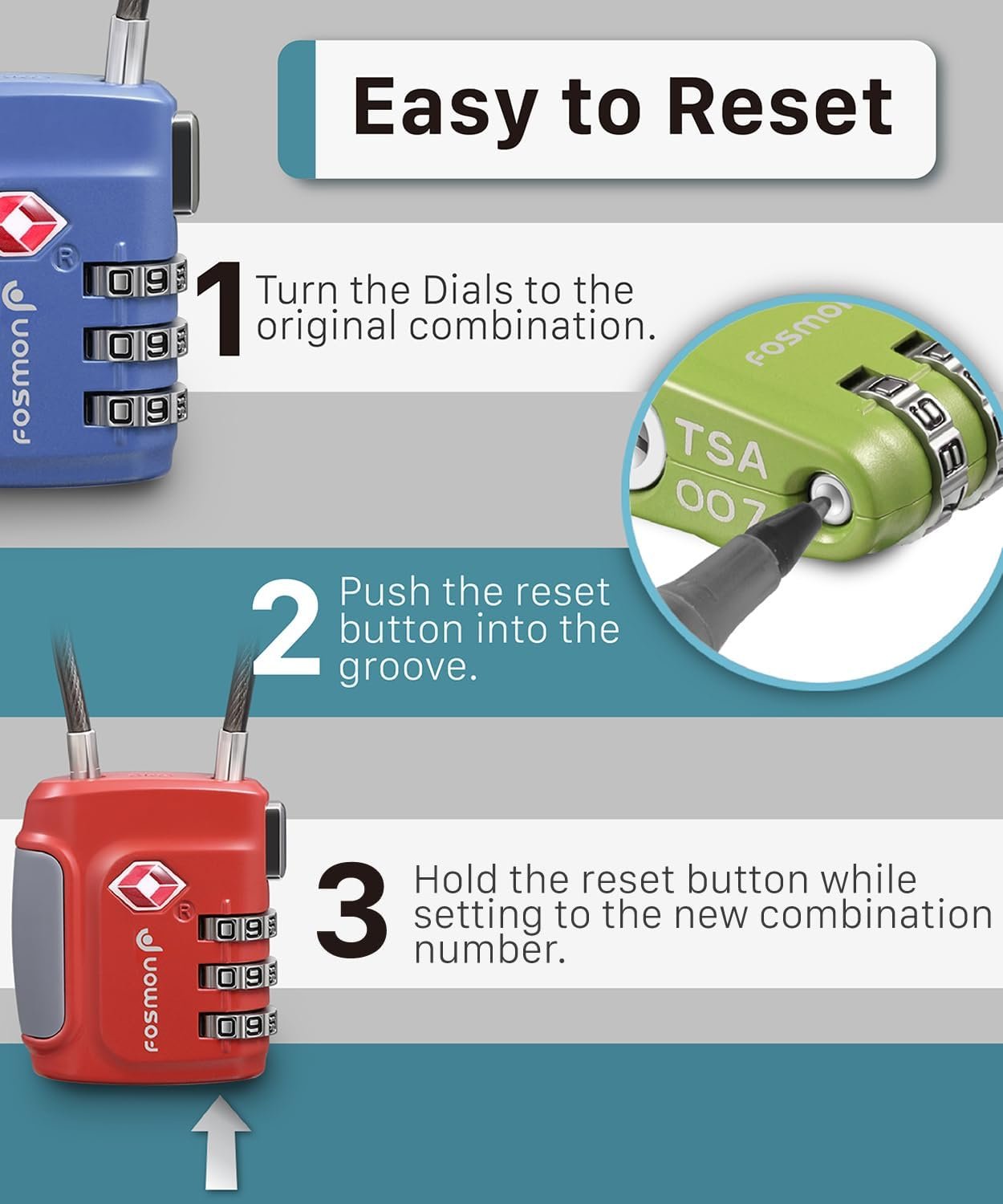 [EASY TO READ AND SET DIALS] The numbers on the dials are easy to read without reading glasses, and you never need to worry about losing the key to your lock. You can easily reset the combination with a pen or other tool, with no worries about resetting it accidentally.