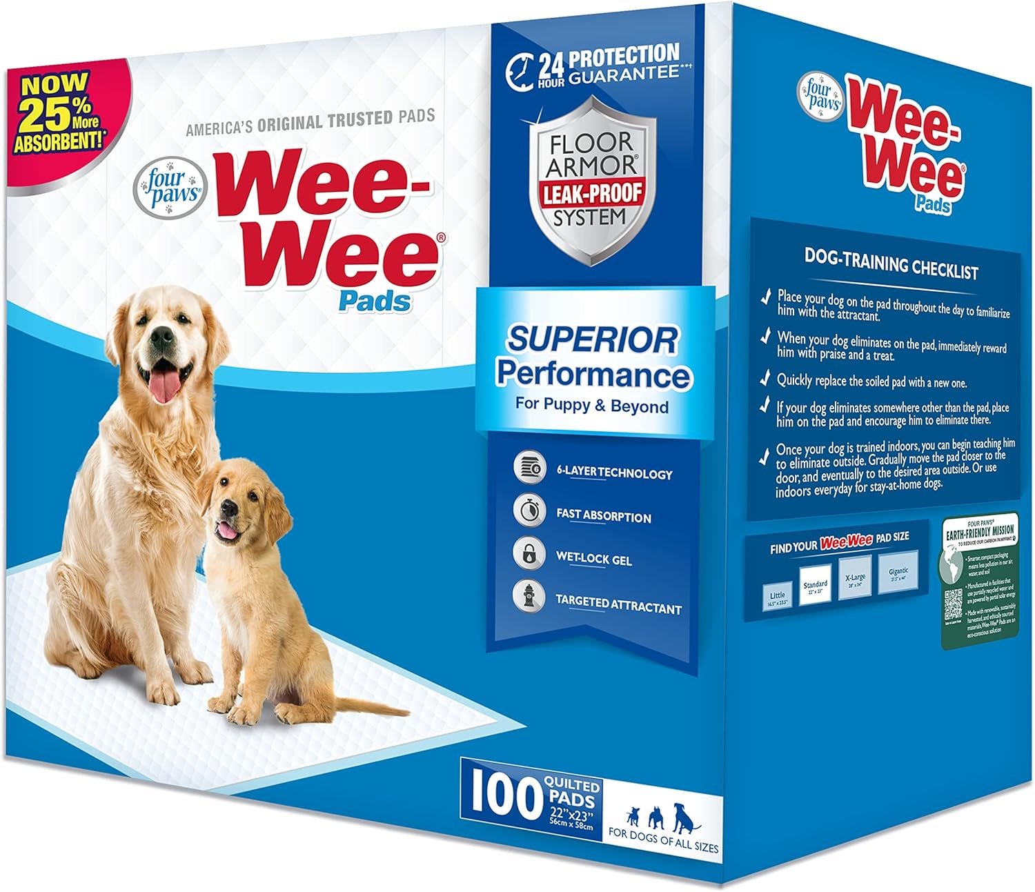 From the creators of America’s Original Trusted Pads, Wee-Wee Superior Performance Pads are more absorbent than ever. In fact, they are 25 percent more absorbent than the original 5-layer Wee-Wee Pads! These dog pee pads are designed with the Floor Armor Leak-Proof System, featuring 6 innovative layers for unparalleled floor protection. With a tear-resistant top layer, absorbent polymer that turns liquid into gel, and a leak-proof bottom to keep floors dry, just one pad offers 24 hour protection—guaranteed. All Wee-Wee pee pads for dogs also include targeted attractant to draw your furry friend to the pad and help prevent potty training accidents elsewhere. Whether you’re training a puppy or just need a comfortable indoor potty spot for your best friend, each pad measures 22 inches x 23 inches and is ideal for dogs of all sizes.