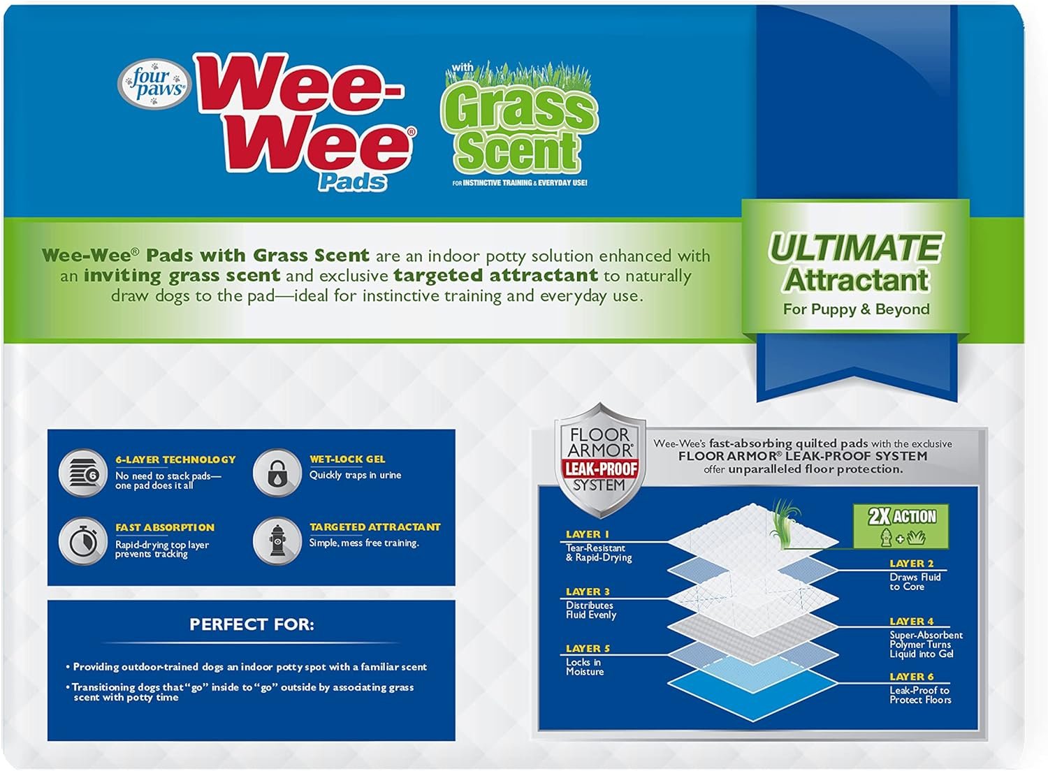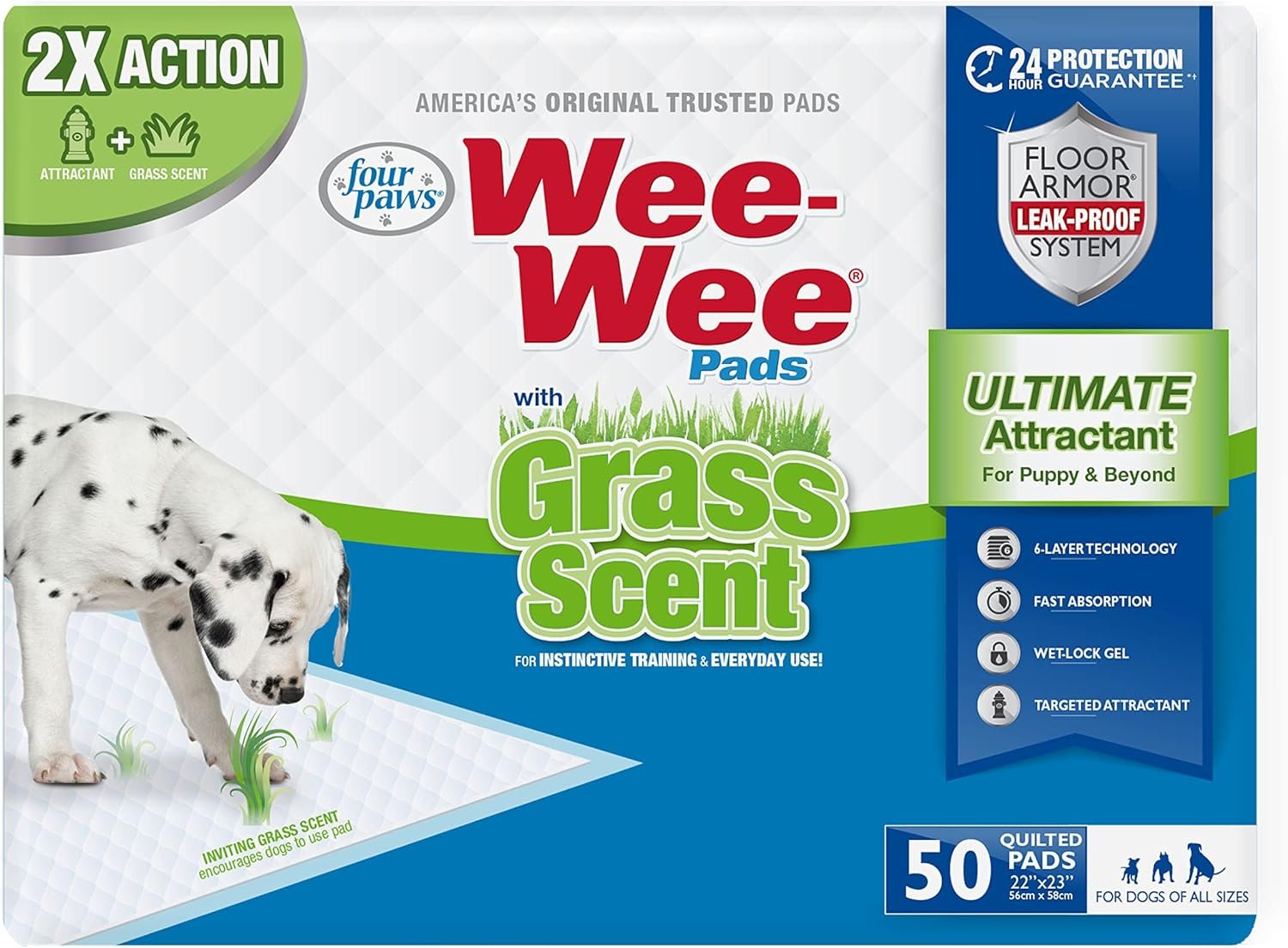 Wee-Wee Ultimate Attractant Dog Pee Pads with Grass Scent are the perfect indoor potty solution for instinctive training and everyday use. Offering 2X action, these pads are enhanced with an inviting grass scent and feature exclusive targeted attractant that naturally draws dogs to the pad. No matter where your dog is trained to go potty, these grass scented puppy pads are the ideal solution. They provide outdoor-trained dogs an indoor potty spot with a familiar scent. Or, if you want to train your dog to go potty outside, these pads help make the transition by associating the smell of grass with potty time. Each pad is designed with a 6-layer Floor Armor Leak-Proof System, including a tear-resistant top layer, absorbent polymer that turns liquid into gel, and a leak-proof bottom layer to keep floors dry for 24 hour protection—guaranteed. Perfect for dogs of all sizes, these Wee-Wee Pads measure 22 inches x 23 inches.