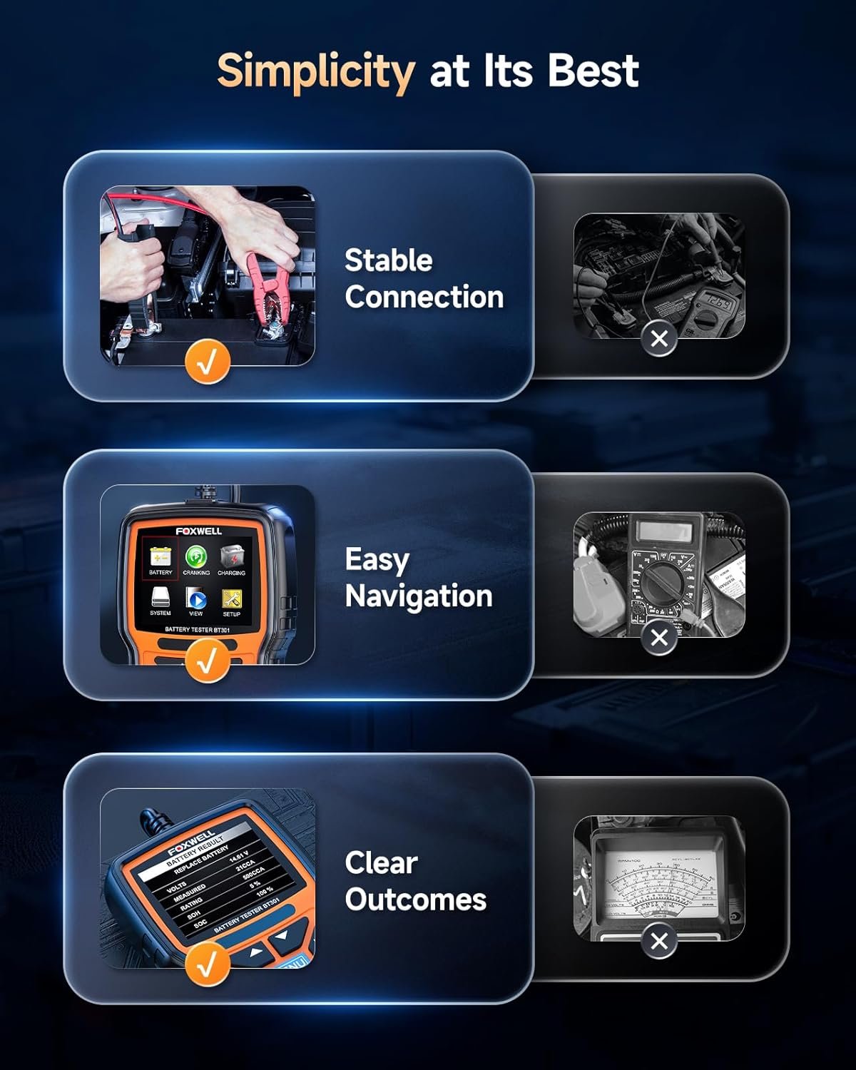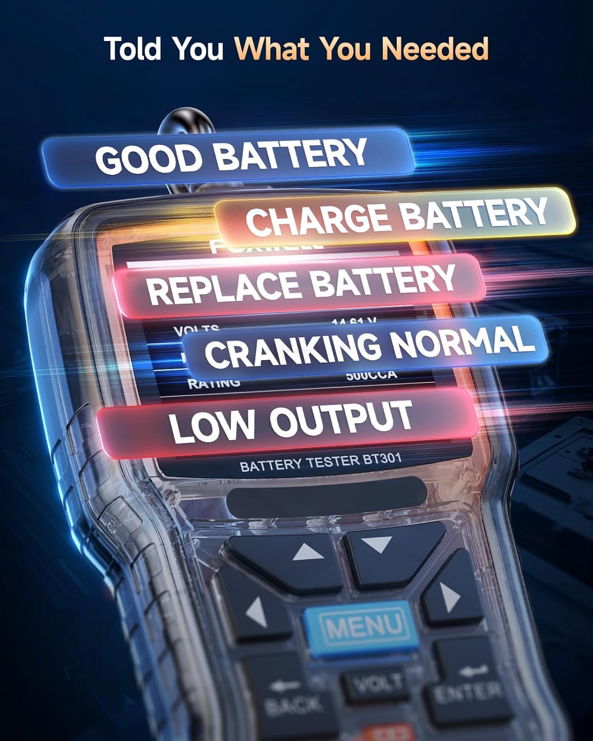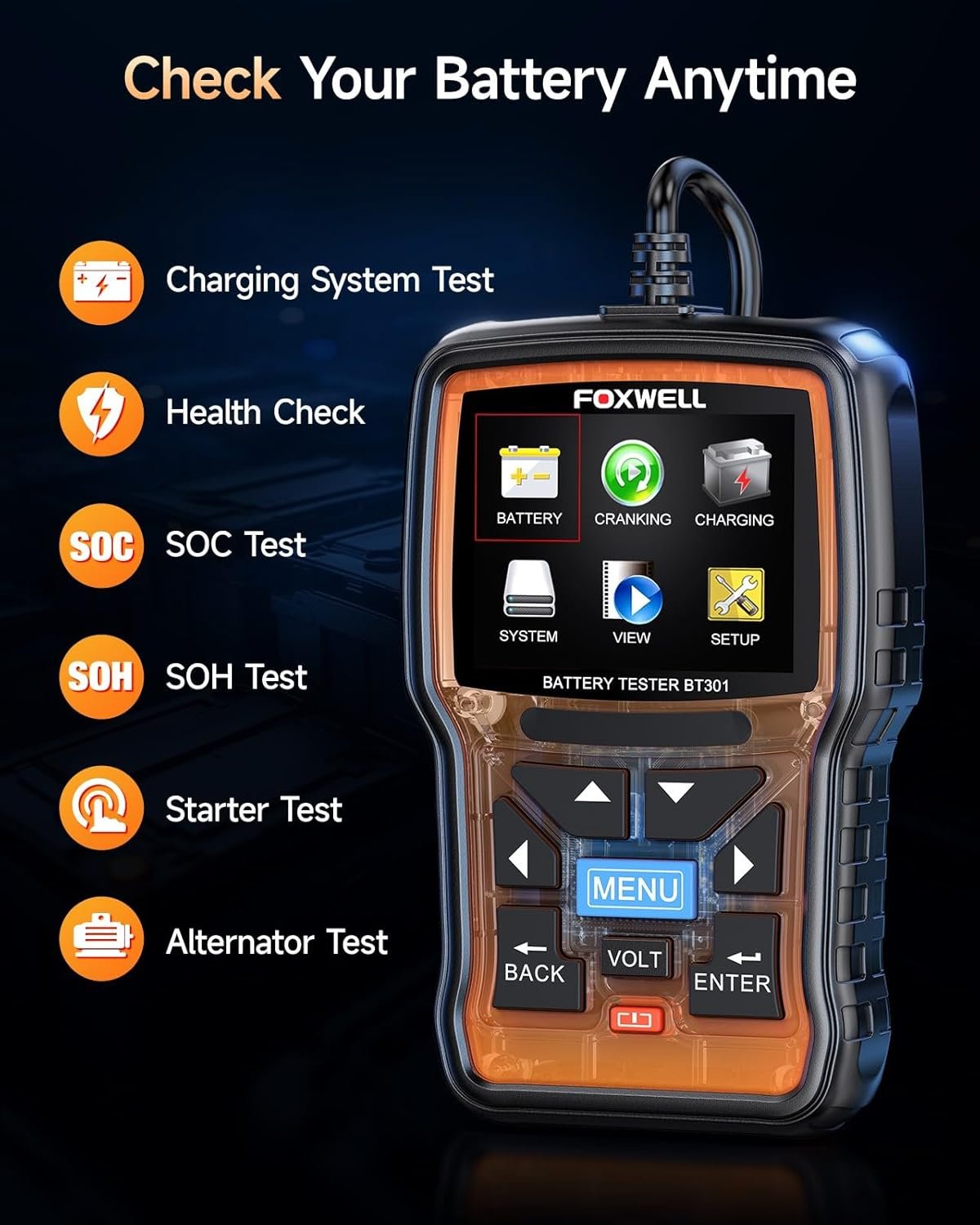 Enhanced Version of FOXWELL BT100 – Building on BT100’s reliability, the BT301 comes with upgraded features, including expanded test functions to assess battery health, starter status, charging system, and alternator performance. Features a vibrant LCD color screen for improved visibility. Equipped with FOXWELL’s premium upgraded chip, the car battery tester delivers fast and highly accurate diagnostics with 99.9% precision. The extended 6.5ft diagnostic cable makes it easy to test from both inside and outside the vehicle without needing extra help. NOTE: Not compatible with Lithium/li-ion or 8V batteries. Any issues, please let us know.