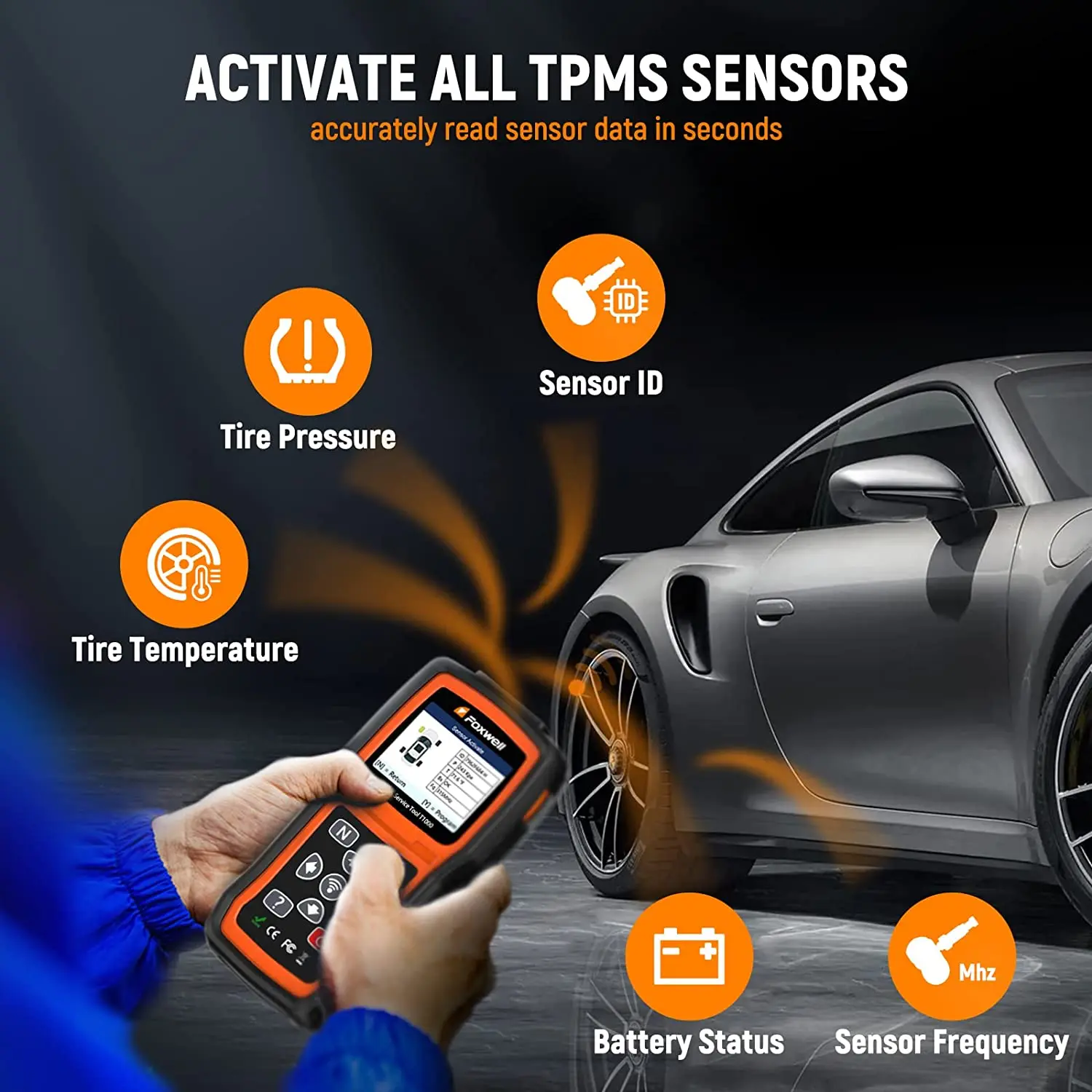 Why is the TPMS light on? Weather if the tire air pressure are too low? Or is the sensor battery too weak? FOXWELL T1000 TPMS diagnostic tool can read the sensor ID, tire pressure, tire temperature, sensor battery, and frequency in seconds, help you figure out all TPMS problems fast.