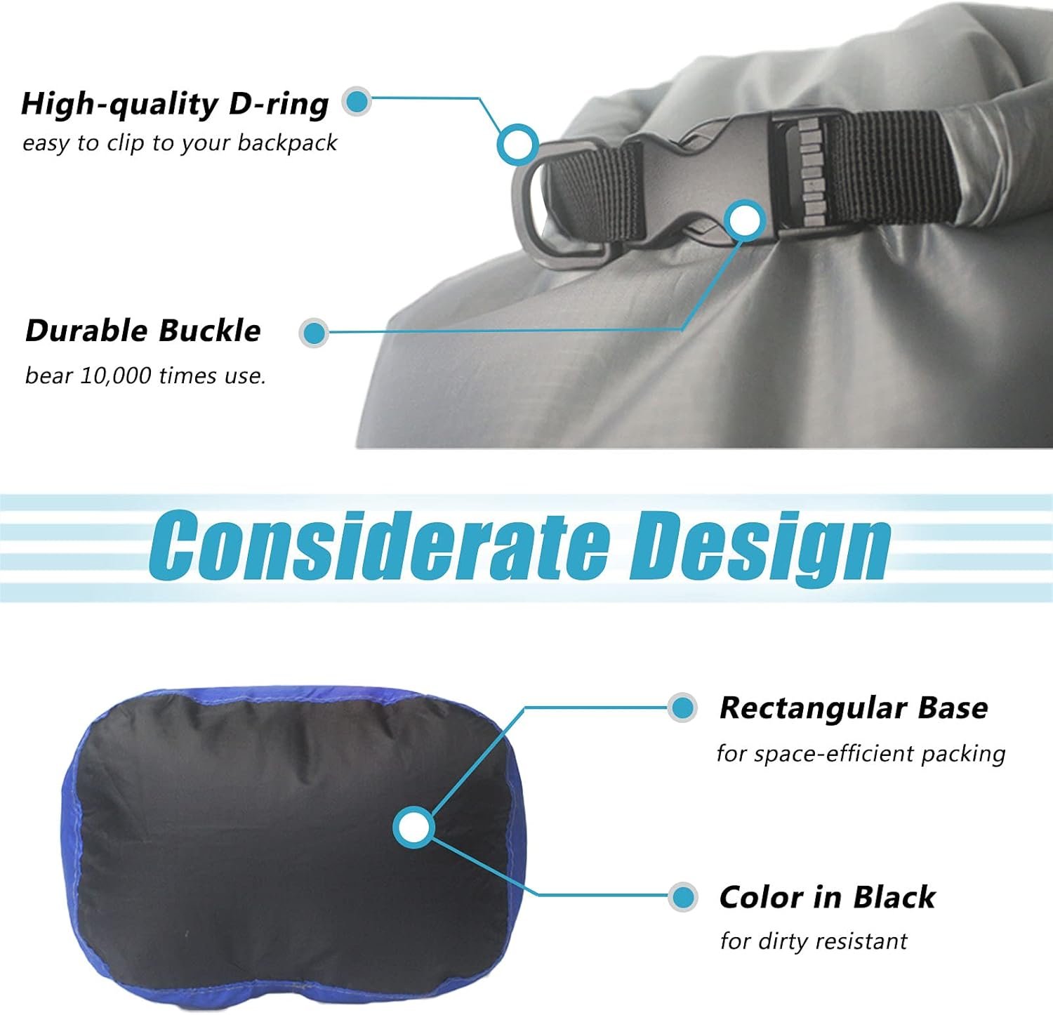 Considerate Design: 1. The base of the sack is rectangular for space-efficient packing, and the black base is dirty-resistant. 2. D-ring is easy to clip to your backpack.