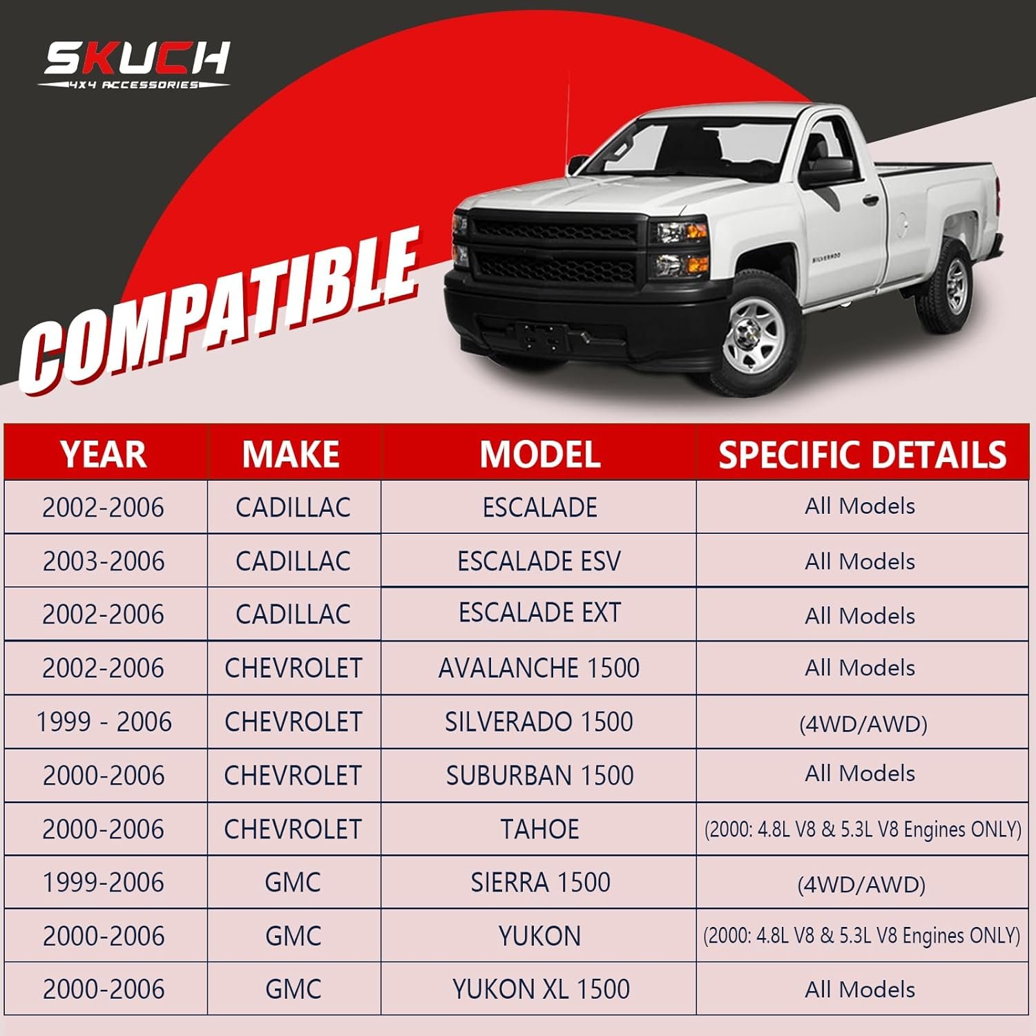 Vehicle Compatibility: Suspension Kit Replacement for 1999-2006 Chevy Silverado 1500 GMC Sierra 1500, 2000-2006 Chevy Suburban 1500 Chevy Tahoe GMC Yukon/Yukon XL 1500 (2000 Tahoe Yukon: 4.8L V8 & 5.3L V8 Engines Only), 2002-2006 Chevy Avalanche 1500 Escalade/Escalade Ext, 2003-2006 Escalade Esv, 2003-2014 Chevy Express 1500 GMC Savana 1500