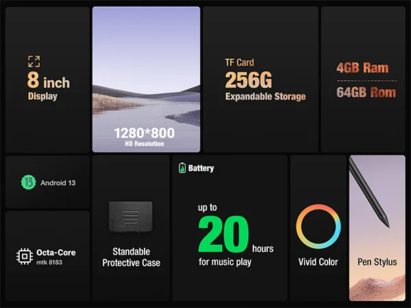 3. Android 13 Drawing Tablet with Pen Display, Standalone Drawing Tablet with Screen No Computer Needed installed with the latest Android 13, powered by MTK quadcore cpu chips, comes with 4GB RAM and 64GB Storage, supports TF card reading up to 256GB, enough storage for Apps and digital drawing.