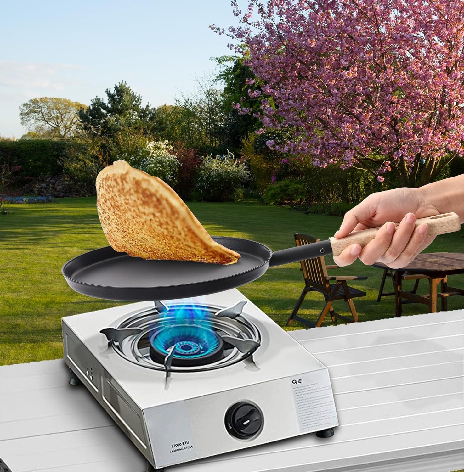 In addition to being easy to carry around for camping, this pan also perfect for crepes, tortilla, dosa tawa, toast, pancakes, eggs, omelet, bacon and more