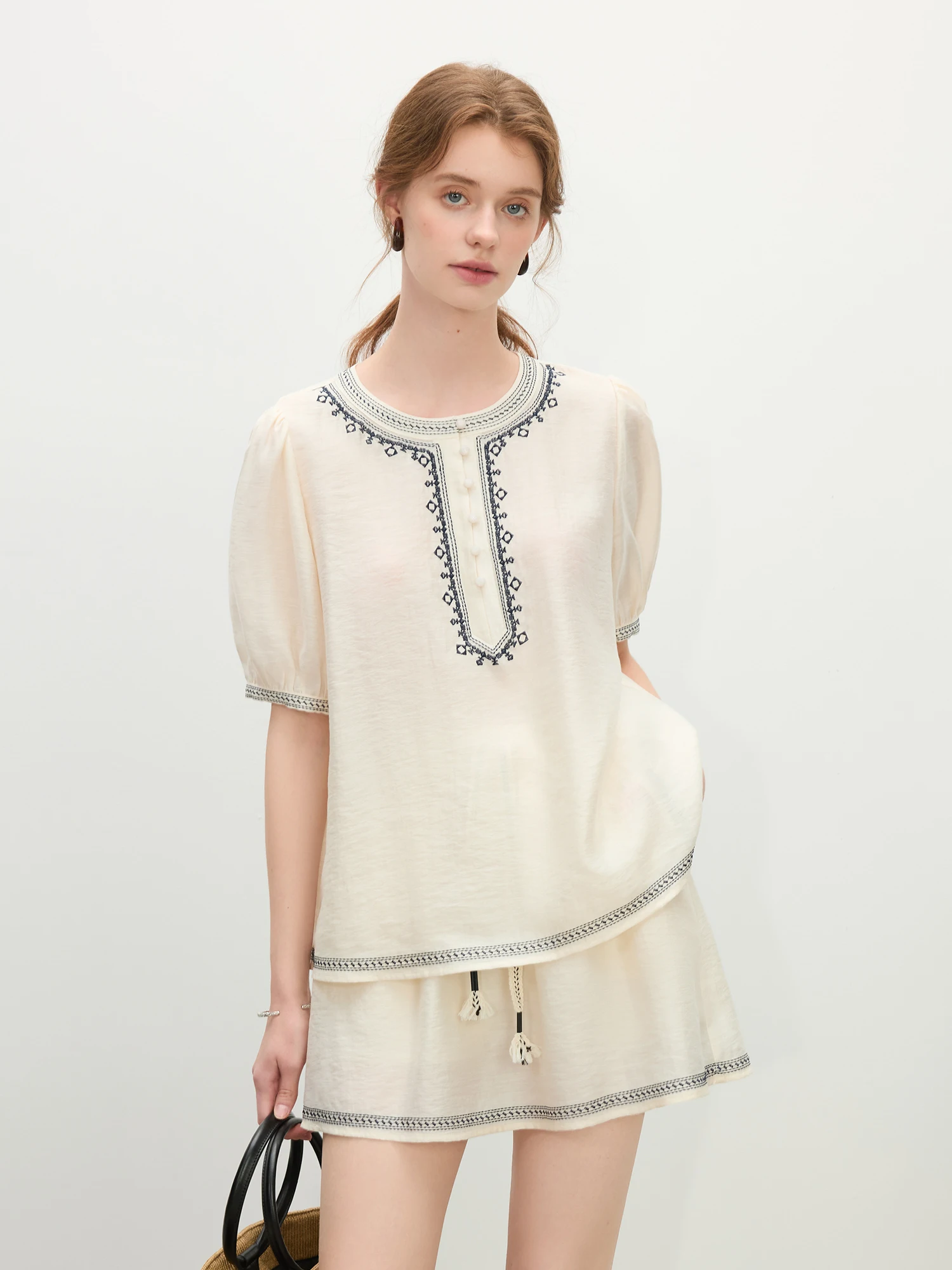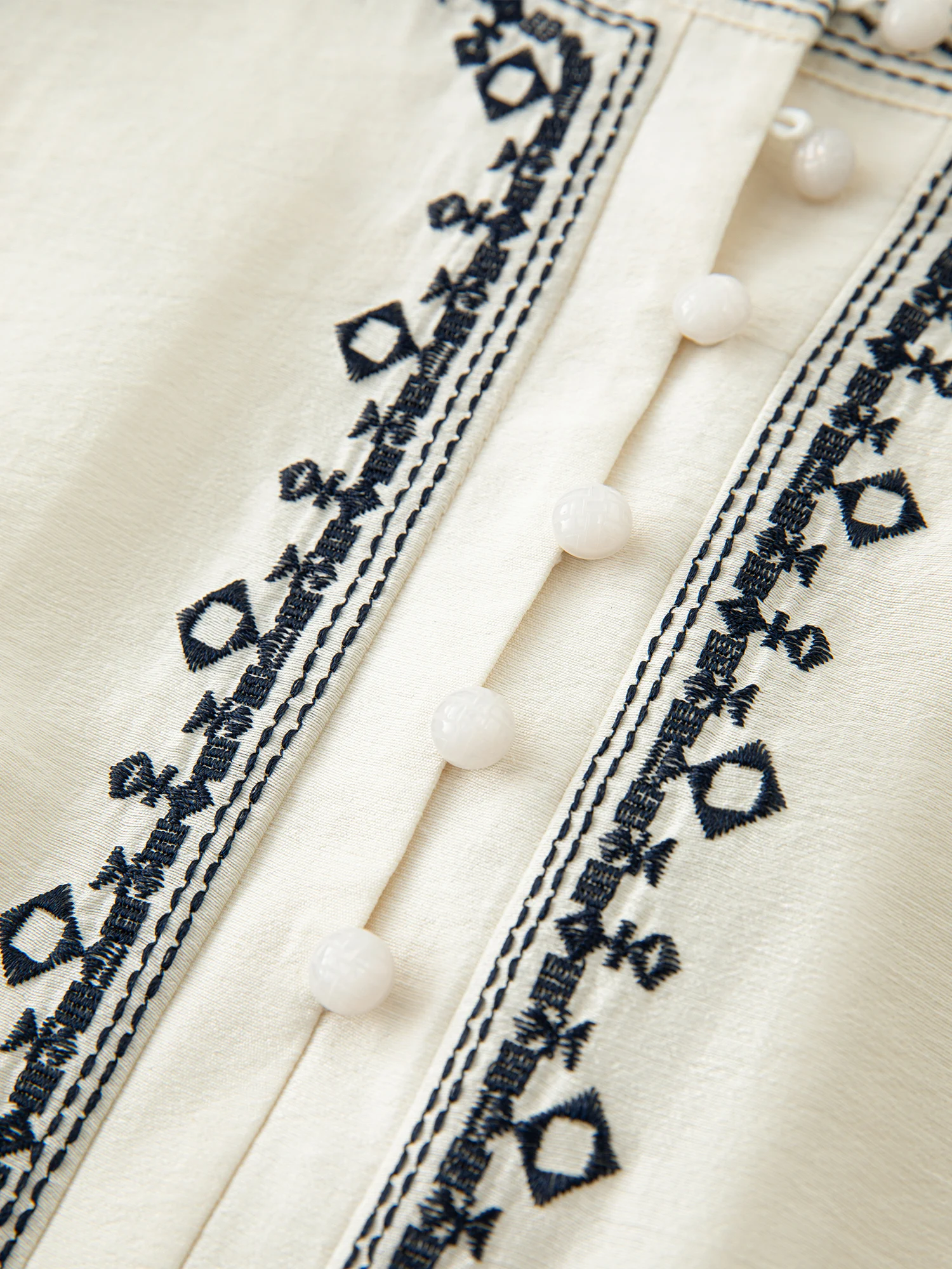 FSLE 2025 Summer Women’s Acetate-Linen Blend Resort Set – Embroidered Boho-Style Shirt & Flowy Skirt Casual Outfit