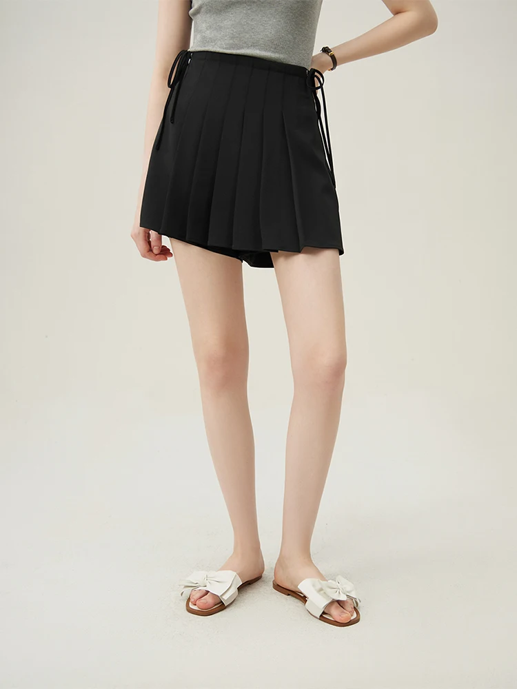 1 review for FSLE Black Pleated Versatile Casual Women Culottes 2024 Summer New Unique Design A-Line Shorts Front Skirt Back Shorts 24FS12313