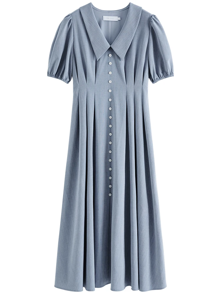 FSLE Temperament Long Women Solid Pleated X-LINE Skirts 2023 Summer Office Lady Button Design Polo Neck Puff Sleeve Dress