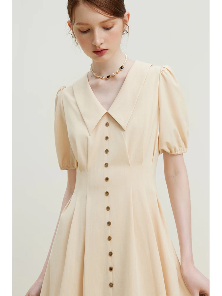 2 reviews for FSLE Temperament Long Women Solid Pleated X-LINE Skirts 2023 Summer Office Lady Button Design Polo Neck Puff Sleeve Dress