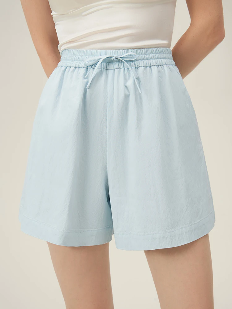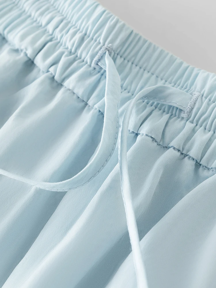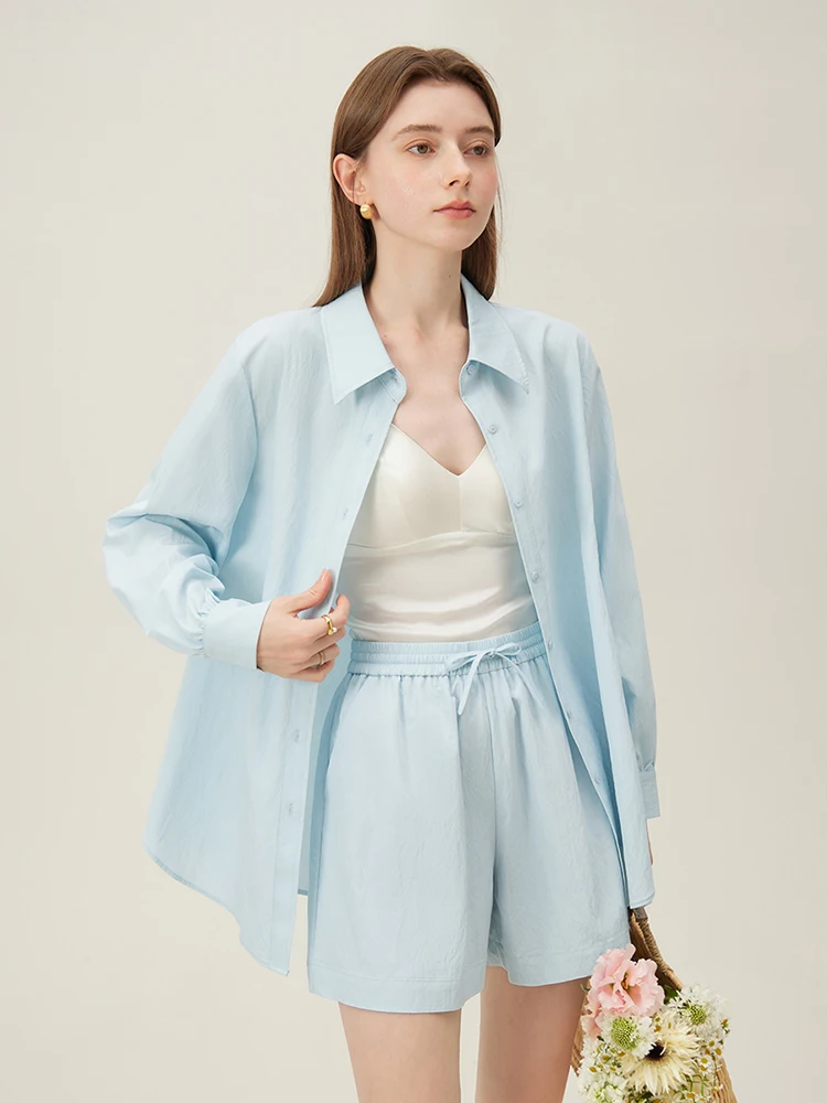 FSLE Women Summer Shirt Skirt Sets Polo Neck Thin Long Sleeve Sun Protecting Tops Elastic Waist Blue Shorts 24FS12147+24FS12148