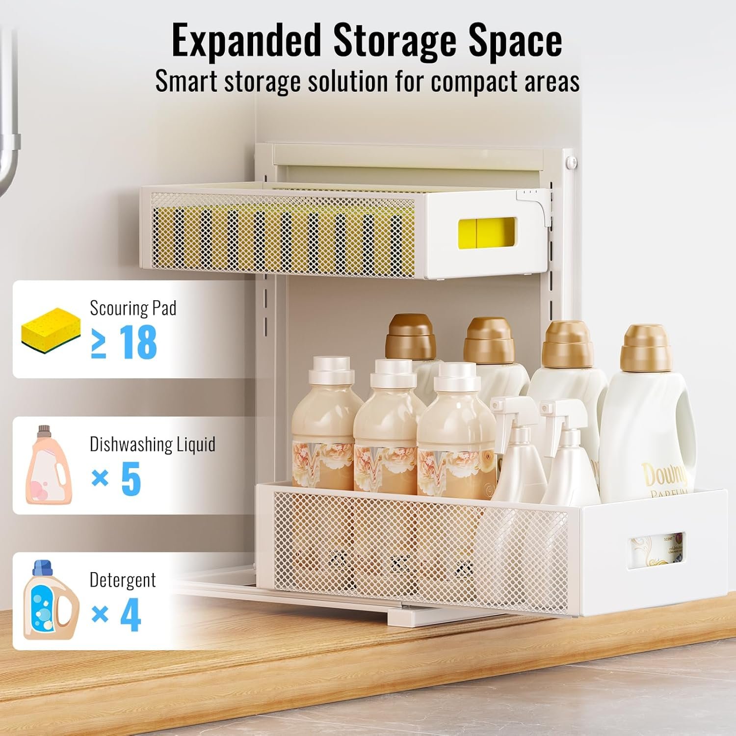 Quick-Release Height Adjustment:The cabinet organizer has 5 levels for effortless customization, fitting various sink sizes instantly—no screws, no hassle, just secure snap-fit stability.