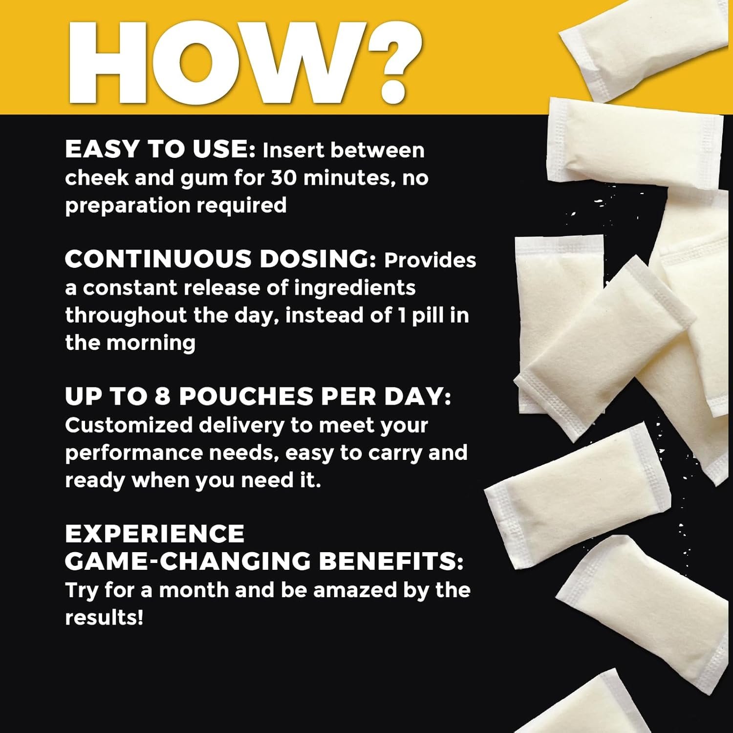 Place one small discreet pouch between cheek and gum. Faster absorbing than traditional nootropic powders or capsules