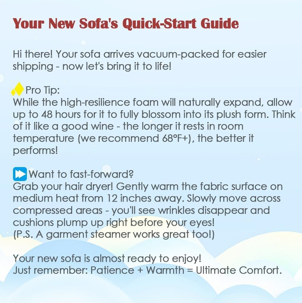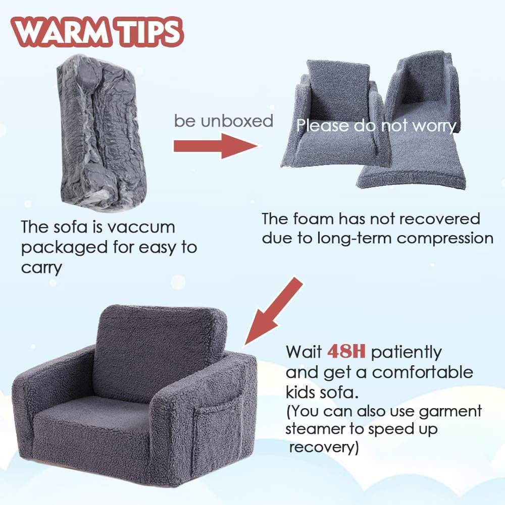 Helpful Hint for Your New Sofa: Your child’s sofa has been vacuum-sealed for convenient transportation. Please be aware that the foam within may need more than 48 hours to fully expand and regain its shape after being unboxed due to long-term compression. We appreciate your patience as it transforms into the perfect sofa. If you’re eager to speed up the process, a garment steamer can be used to expedite the foam’s expansion and smooth out any creases