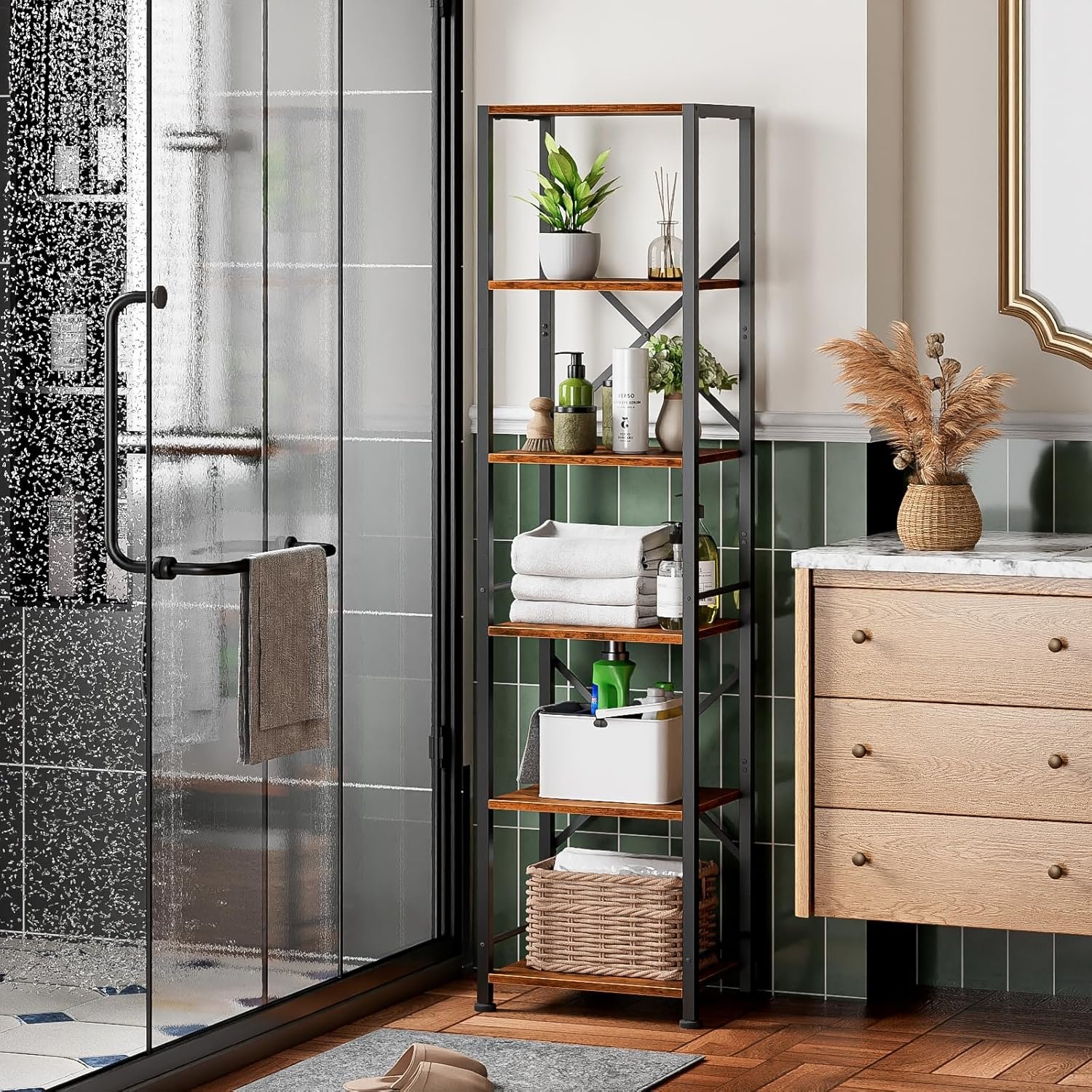 [Fit for Any Room]: Our tall bookcase compact design means it takes up a small floor space to make full use of your vertical space, so its perfect size fits any room. Modern and rustic appearance makes it easy to match with other furniture. You can place it in the living room, bedroom, office, balcony, entrance, hallway, bathroom, kitchen, garage, etc. Add a touch of stylish charm to your home or apartment!