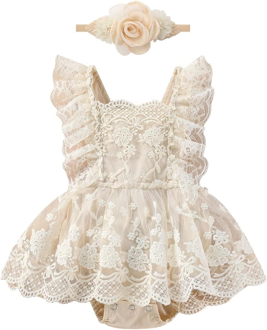 Baby Girls Princess 1st Birthday Outfit Lace Romper Dress Smash Cake Dress with Headband Boho Outfit for Photoshoot