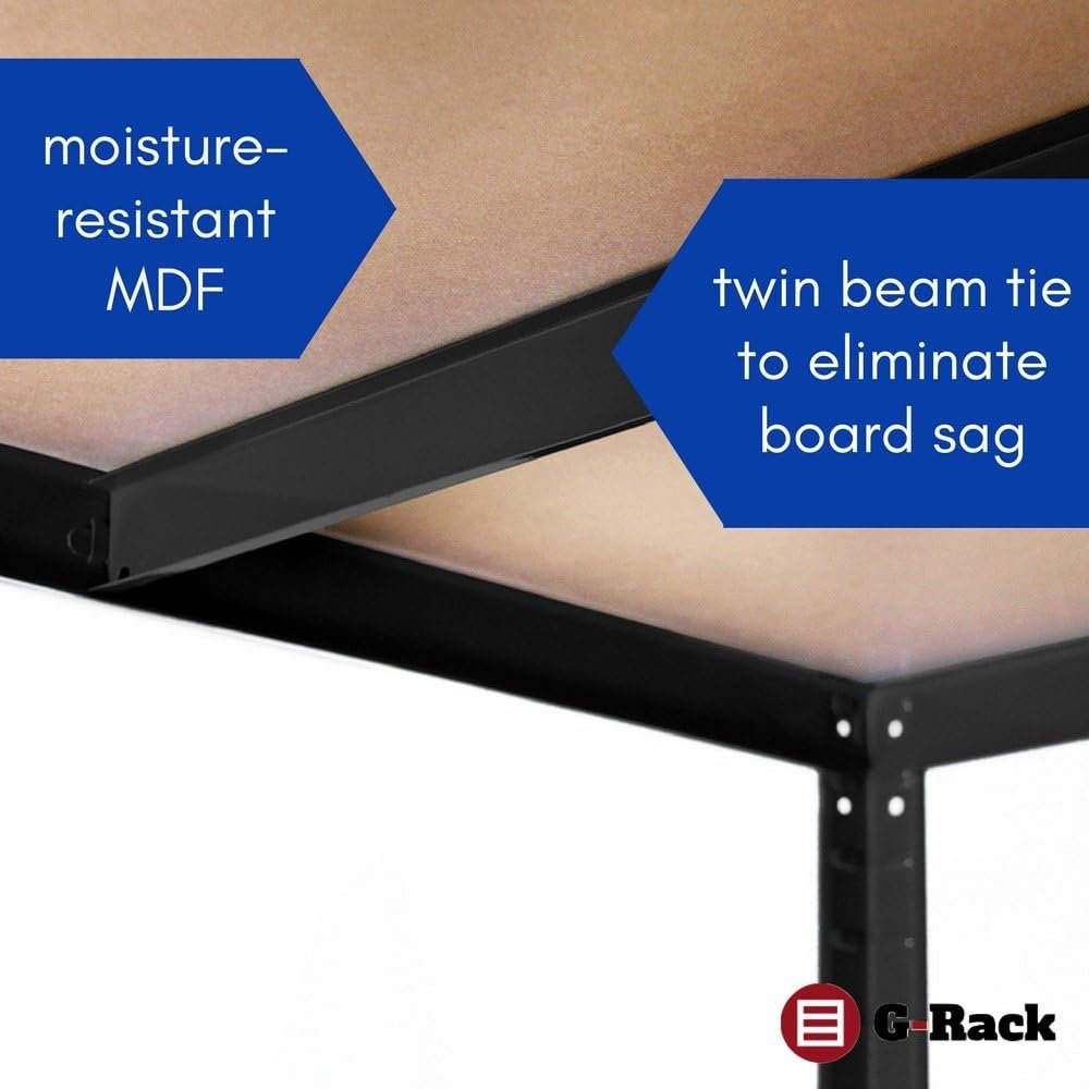 Fully tested to hold an extra heavy 175kg on each shelf (875kg per bay in total!). Each shelf is supported by a beam tie and made from moisture-resistant MDF to eliminate board sag.