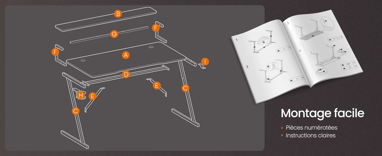 ã€MONTAGE FACILE】La structure simple, les pièces numérotées et les instructions claires font du montage de ce bureau gamer un jeu d’enfant, pour que vous puissiez plonger rapidement dans l’univers du jeu