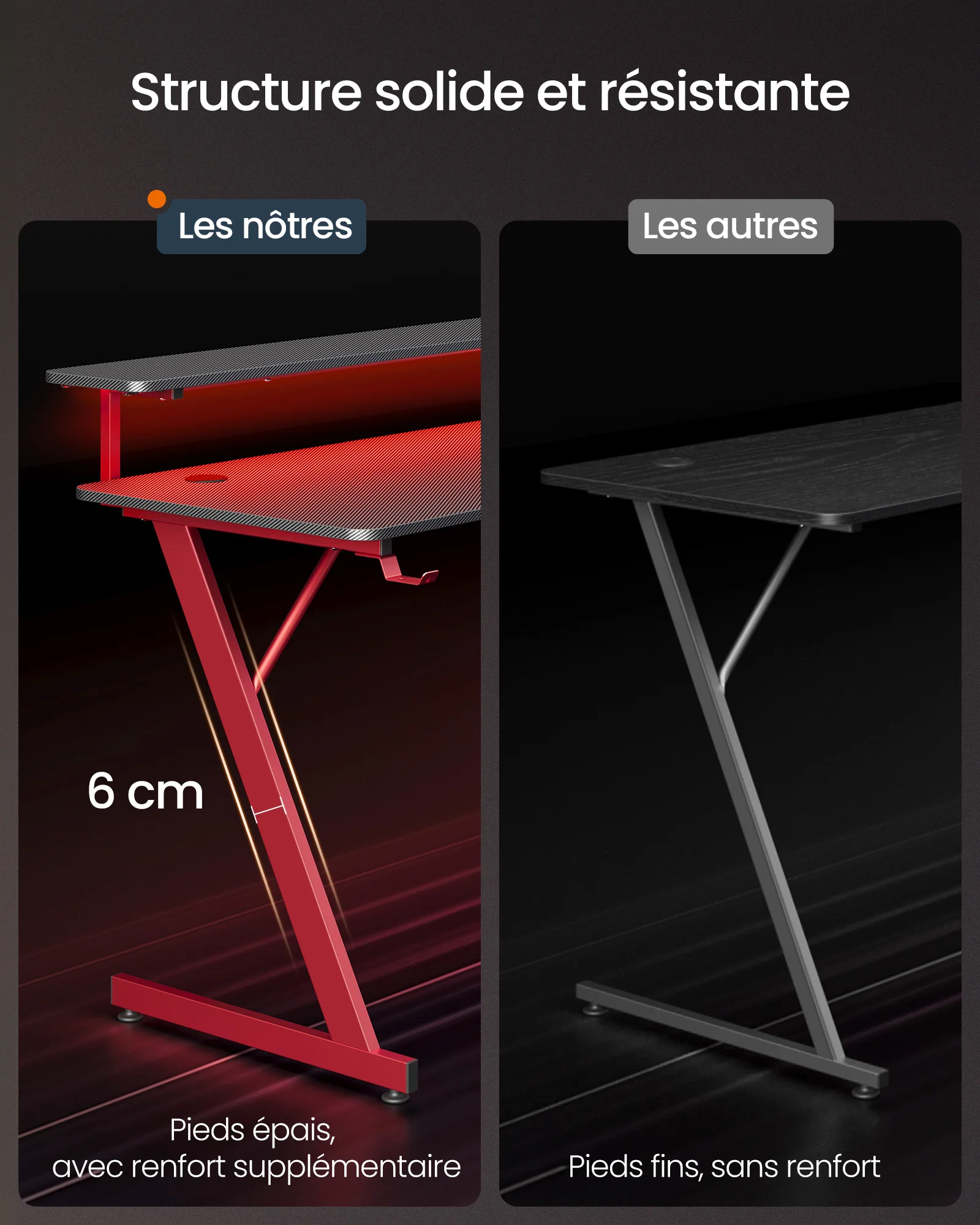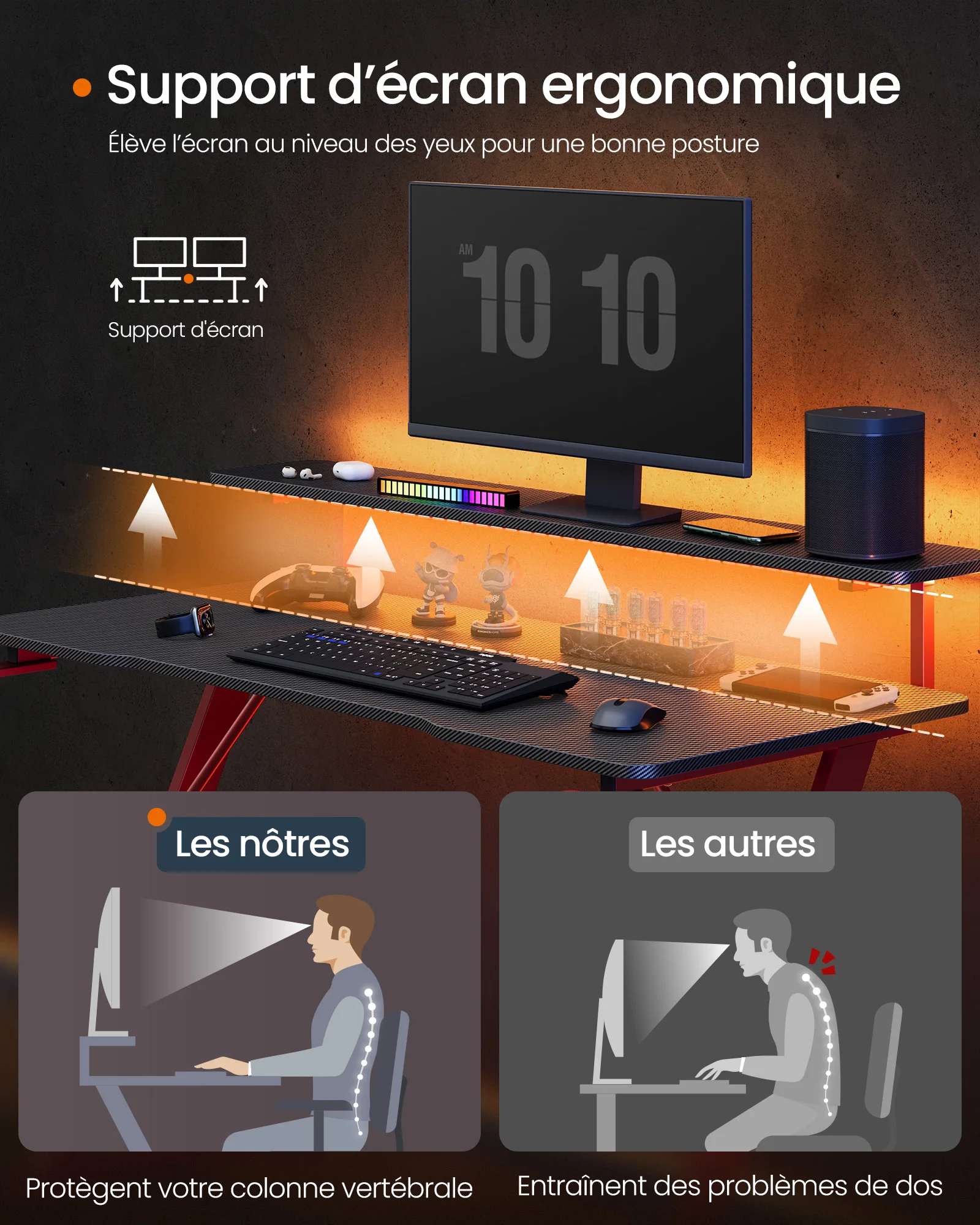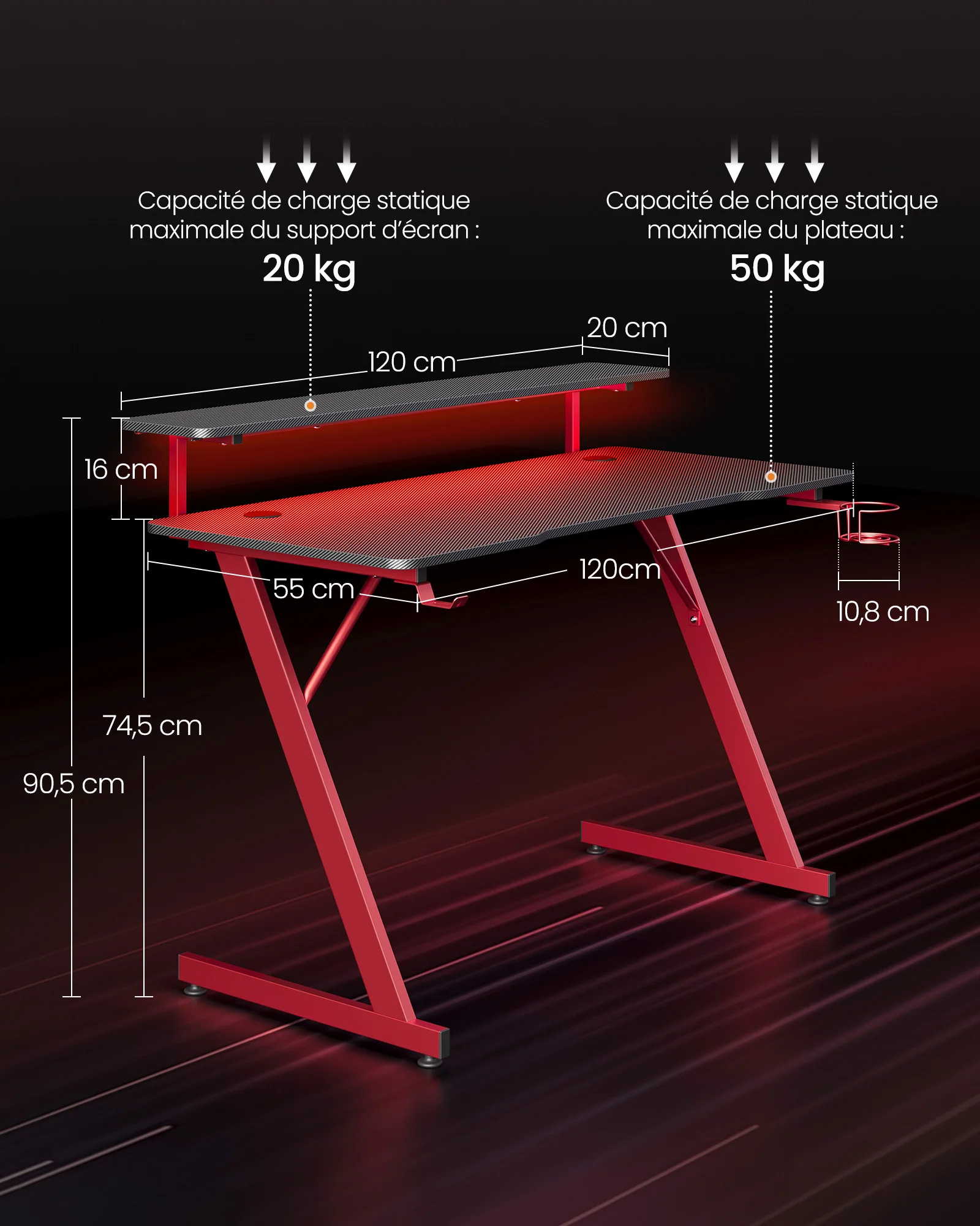 Capacité de charge élevée : Ce bureau gaming supporte jusqu’Ã 50 kg sur le dessus et 20 kg sur le support d’écran