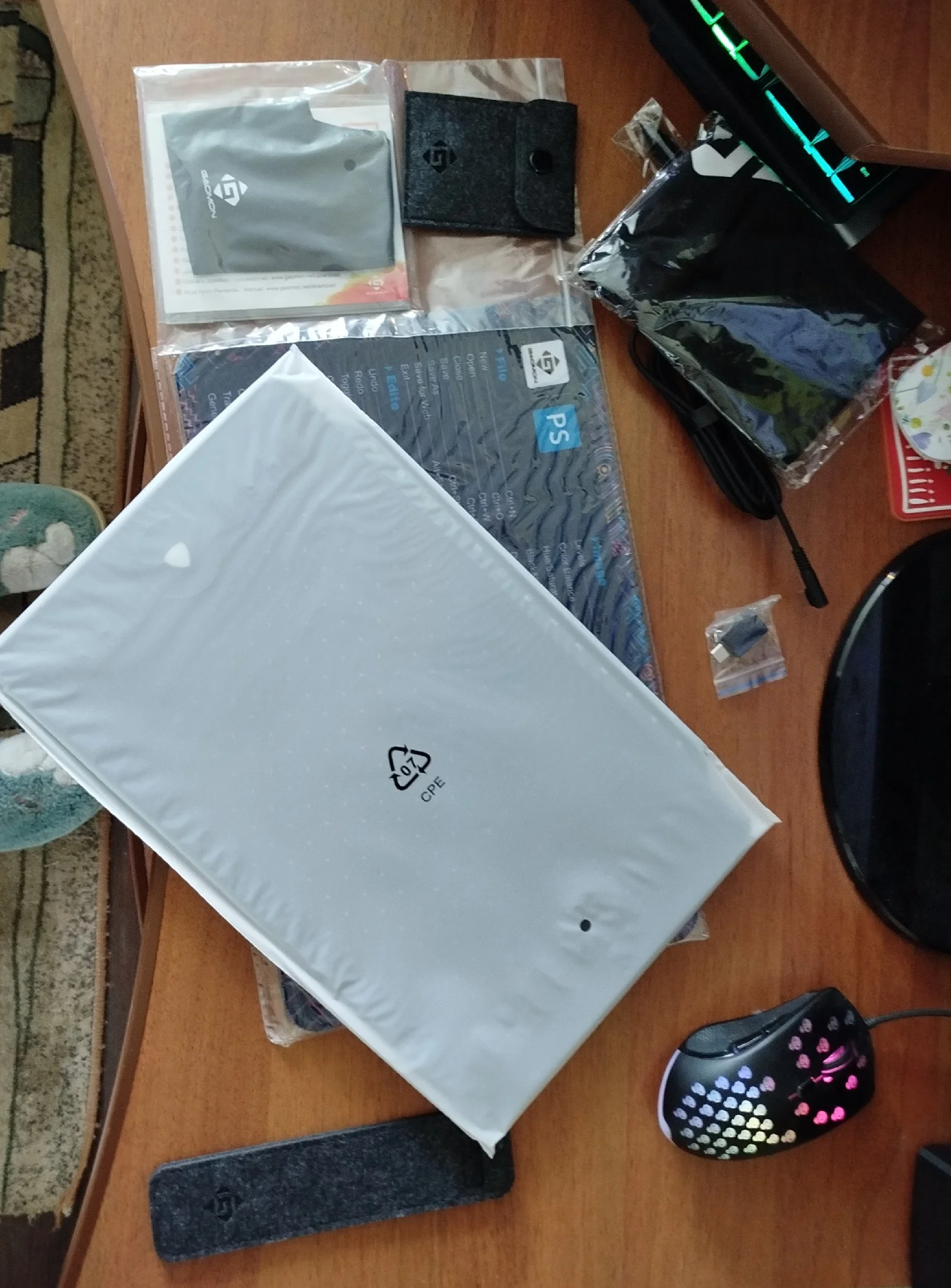 The kit includes a mouse pad and a film for the tablet. The tablet itself is light, compact, which is especially pleasant compared to the previous model. The buttons are easy to press and quite quiet.