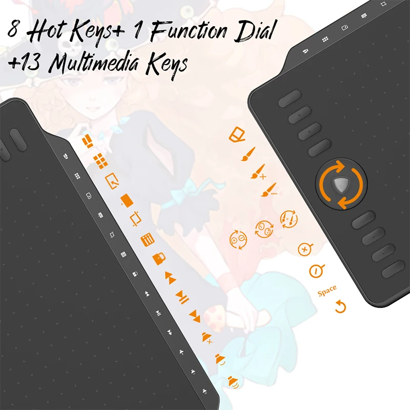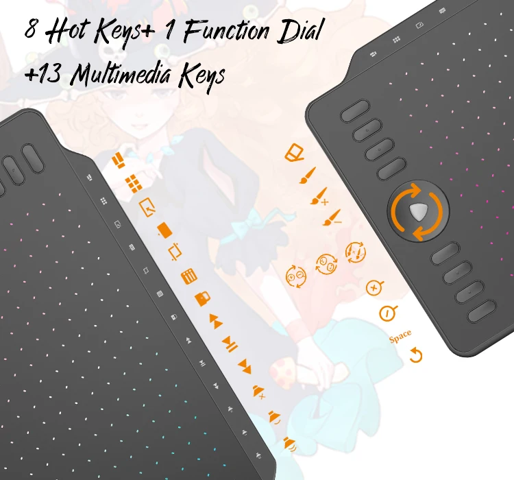 13 Multimedia Buttons: M1220 is the first pen tablet equipped with 13 multimedia keys, you can control the music, volume adjustment.
