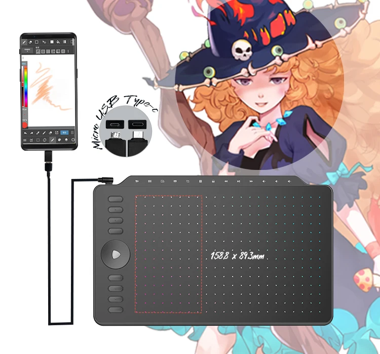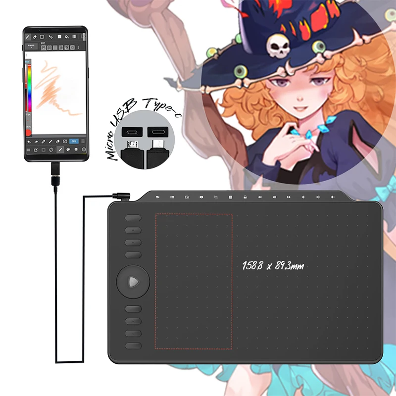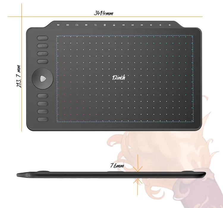 258.4 x 161.5mm/12inch (for computer) and 161.5 x 90.8mm (for Android Phone); Sensing Height: 10mm, can quickly capture your brush; Accuracy: ±0.3mm, accurately responds to your pen as you draw.