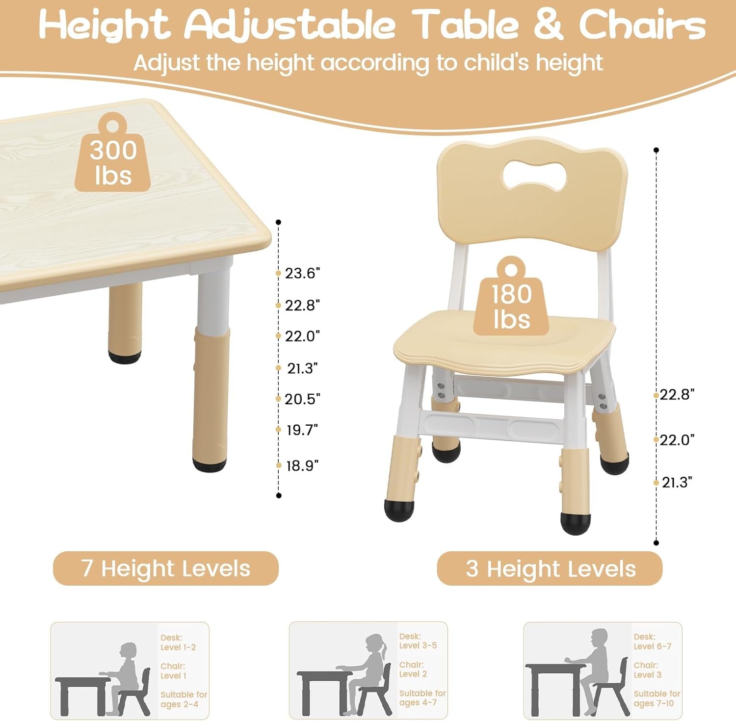 2️⃣[Height Adjustable Table & Chairs] Kids table and chairs are both height-adjustable, suitable for kids from 2-10 years old. 7 height levels for the table from 18.9″ to 23.6″ plus a foot spinner to cope with uneven ground, 3 height levels for the chair seat from 21.3″ to 22.8″. As your lovely baby grows up, they will be always by your side. Here in the little kids table and chair set, all the wonderful stories of you and your little one will be memorized. Table top: 23.6″x23.6″, Maximum weight capacity of table: 300lb, maximum weight capacity of chair: 180lb.