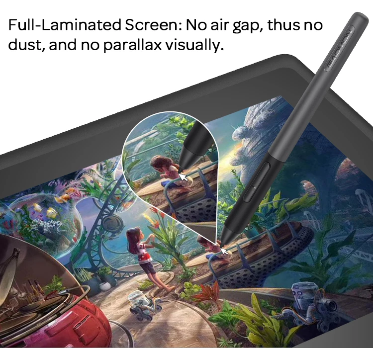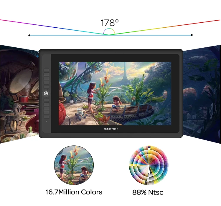 With Full-laminated technology adopted, no air gap,visually the parallax will be deduced to the lowest level. Color Gamut: 88% NTSC. Screen Solution: 1920*1080 [SCREEN FILM ]-With AG film applied on screen, it protects your eyes, and meanwhile increase paper-like drawing experience. [OTHER DISPLAY INFO]– Viewing Angle: 89°/89°(H)/89°/89°(V) (Typ.)(CR>10). Display Area: 476.64 x 268.11mm(18.8*10.6 inches).