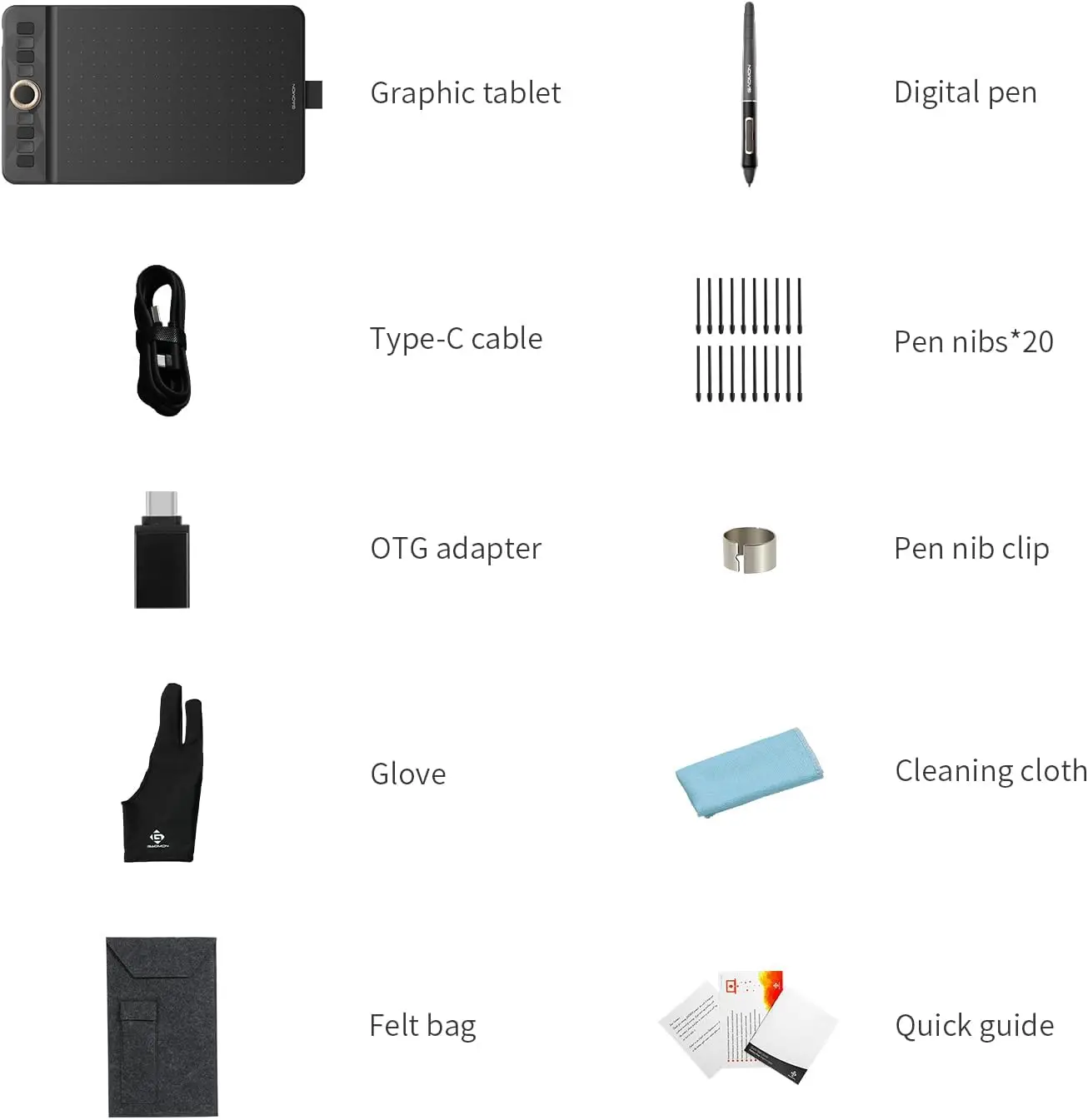 Package contents: Pen Tablet * 1, Pen Nib*20, Nib Clip*1, Sleeve*1, Glove*1, USB-C Adapter * 1, Quick Start Guide * 1, Blue Cleaning Cloth*1, USB-C Cable(1.5m)*1, Artpaint AP52 * 1.