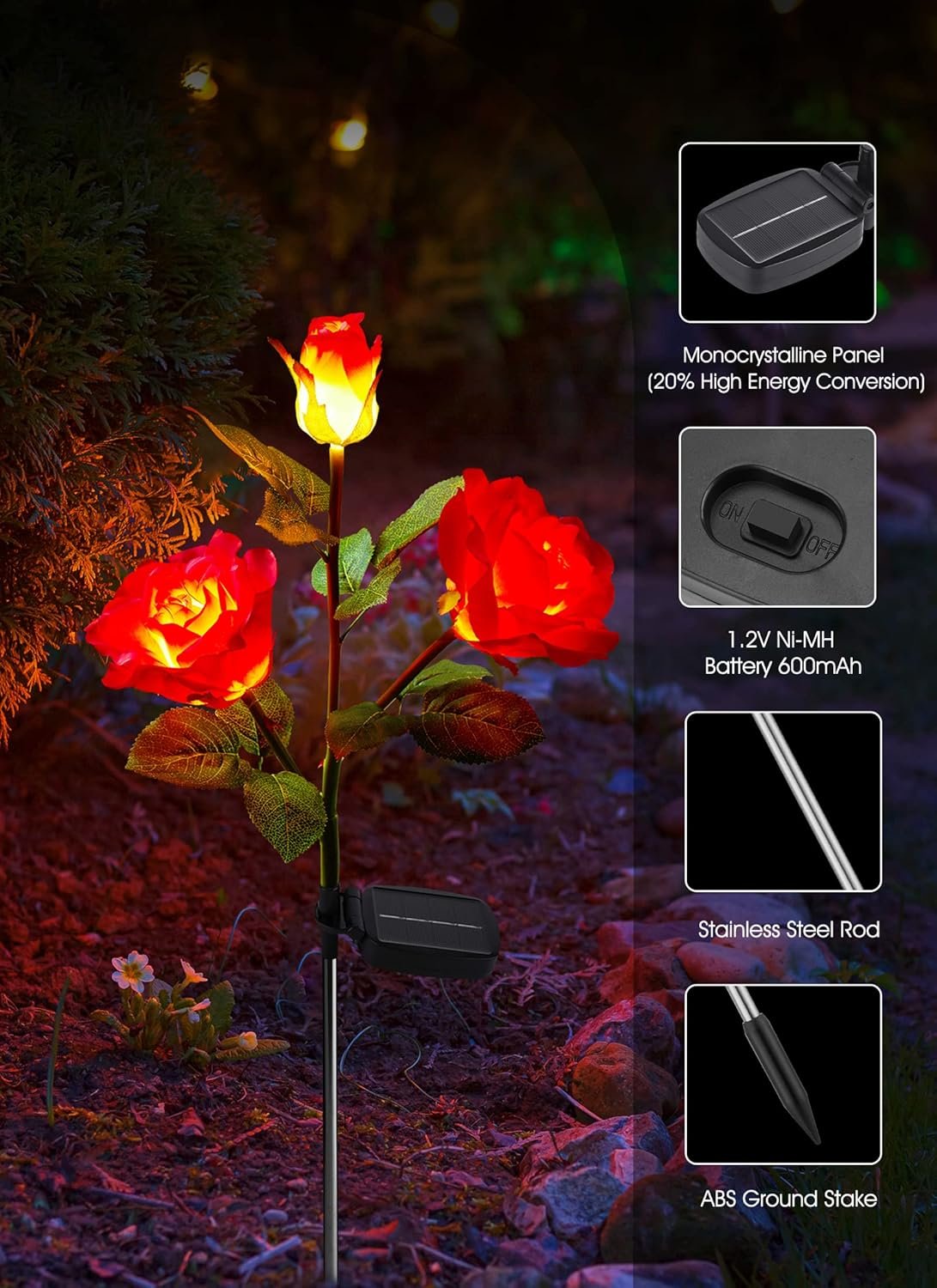 Quality Solar Panel: Upgraded solar flower garden pathway lights with built in 1.2V, 600mAh Ni-MH battery, 6-8 hours fast charging for 10-12 hours operation, 120 degree adjustable for easier sunlight reception