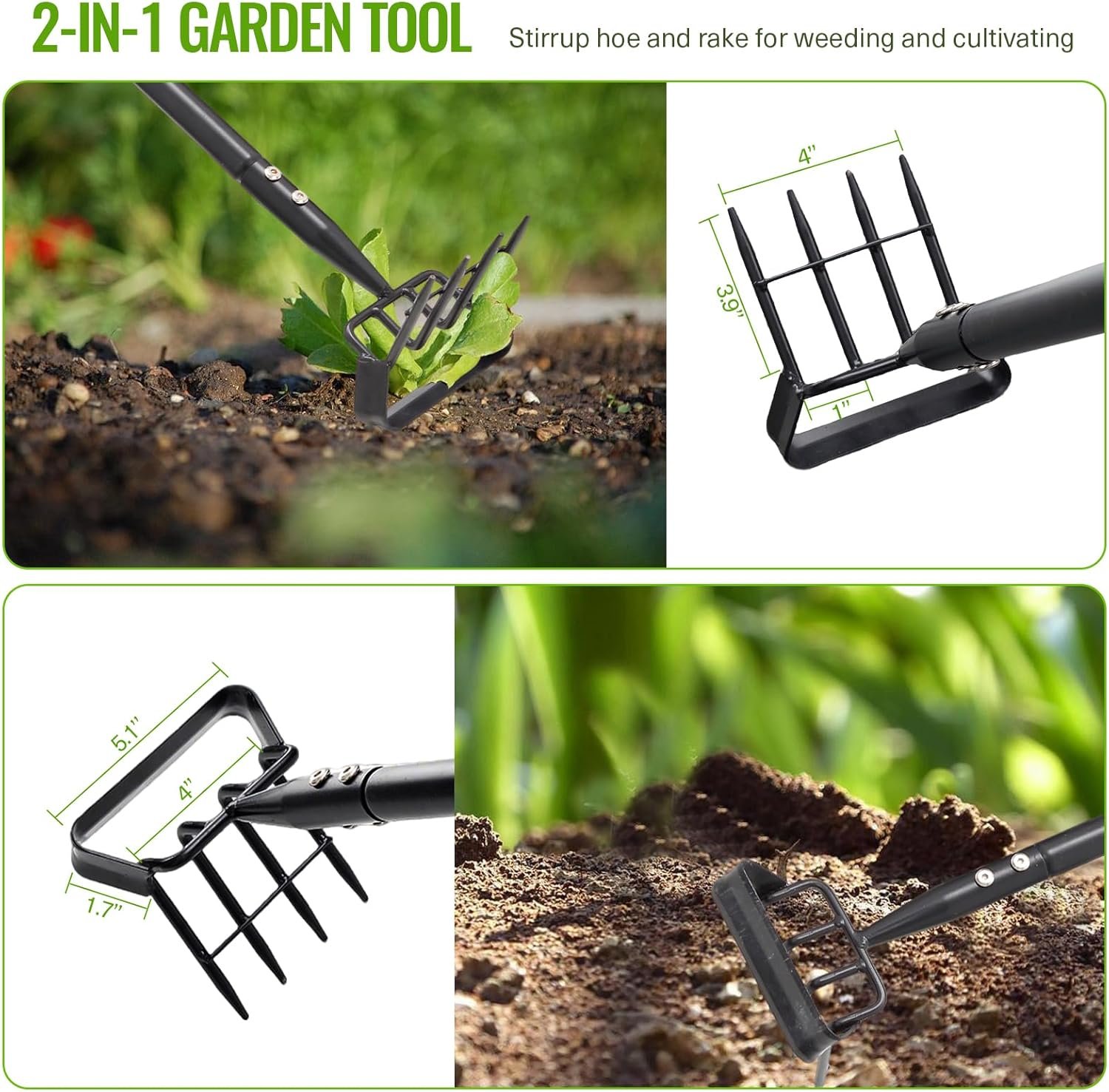 【2-in-1 Garden Hoe Tool】This Hoe for gardening has two types of functional rake heads, whether you need to weed, loosen, or dig soil, it is the right tool for the job, just with a simple flip of the handle.