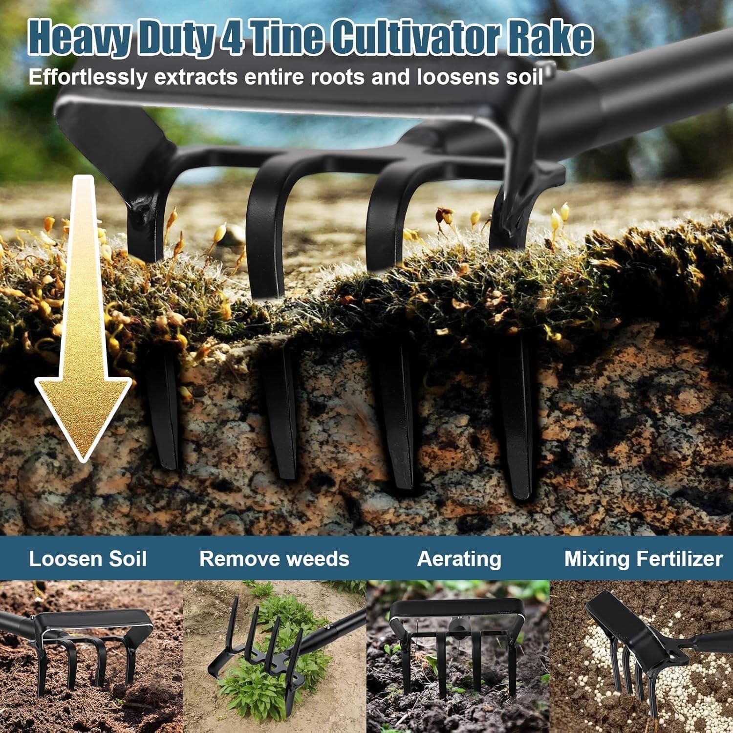 Dual-Function Garden Tool for Effortless Gardening! This 2-in-1 stirrup hoe with rake is a versatile and durable tool designed for weeding, soil loosening, furrowing, and maintaining garden paths. With a sharp carbon steel blade for quick and easy weeding, and a heavy-duty 4-tine rake for loosening soil and aerating, lets you tackle both soil prep and weed removal in one go,making your gardening tasks faster and easier!
