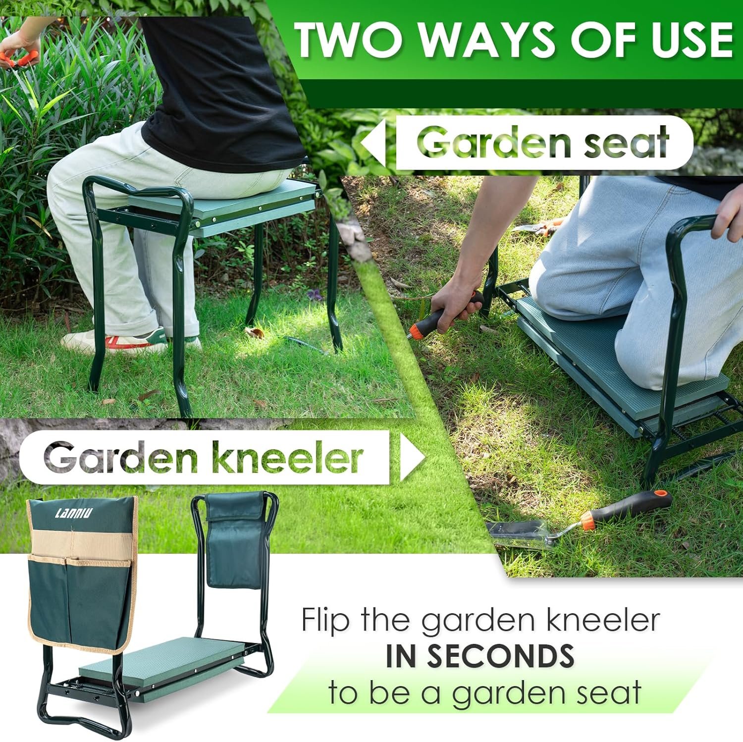 Multi Purposes: Raise the legs to make a comfortable chair when planting or fishing. Lay it flat on the ground for a supportive kneeling pad when weeding, seeding, producing, or other operation requiring kneeling in the garden.