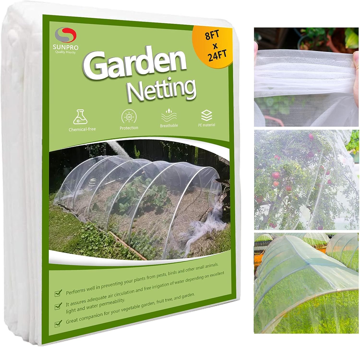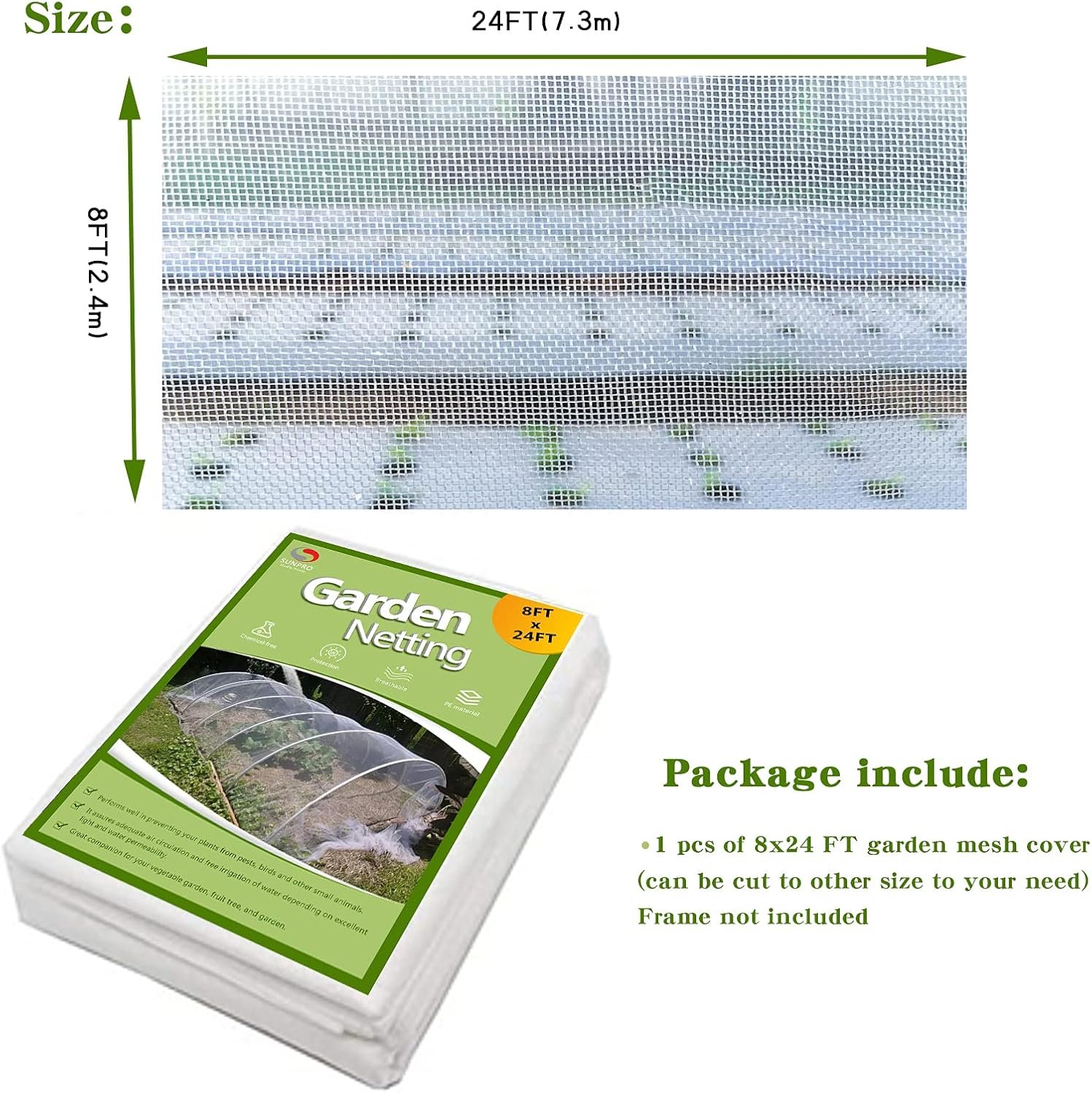 【Versatile and Easy-to-Use】Our netting for garden protection is available in a large 8×24 feet size, providing ample coverage for your garden. You can easily cut the fine mesh plant netting to any size, depending on your needs. You can place the bug screen directly over your plants or individually enclose the tree crowns. You can also use hoops to support it and protect your greenhouse, row cover, raised bed, or entire garden.