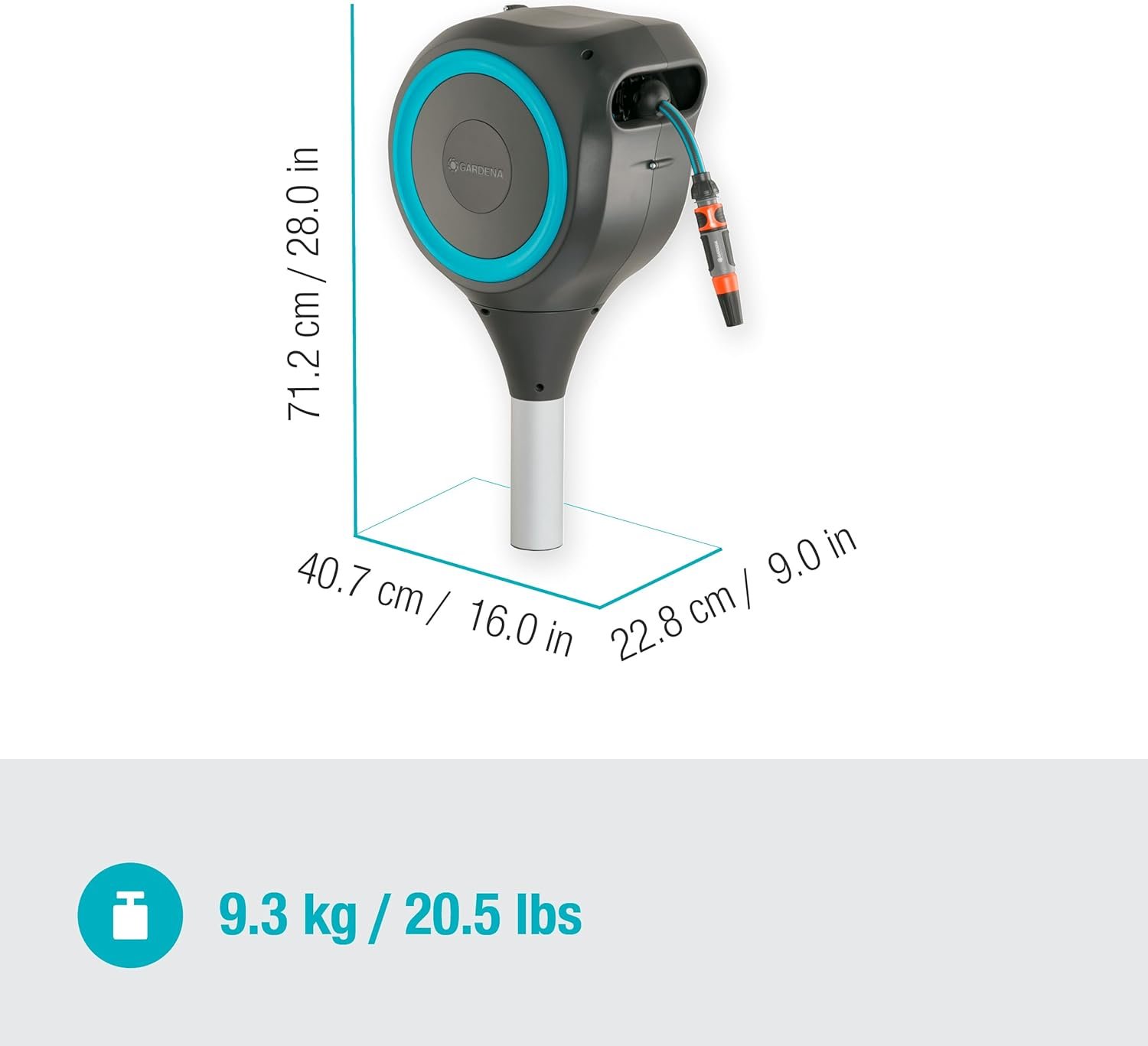Items delivered: 1x GARDENA Retractable Hose Reel, GARDENA premium hose, Metal spike, mounting rod, 5 ft connecting hose, connection fittings and infinitely adjustable spray nozzle