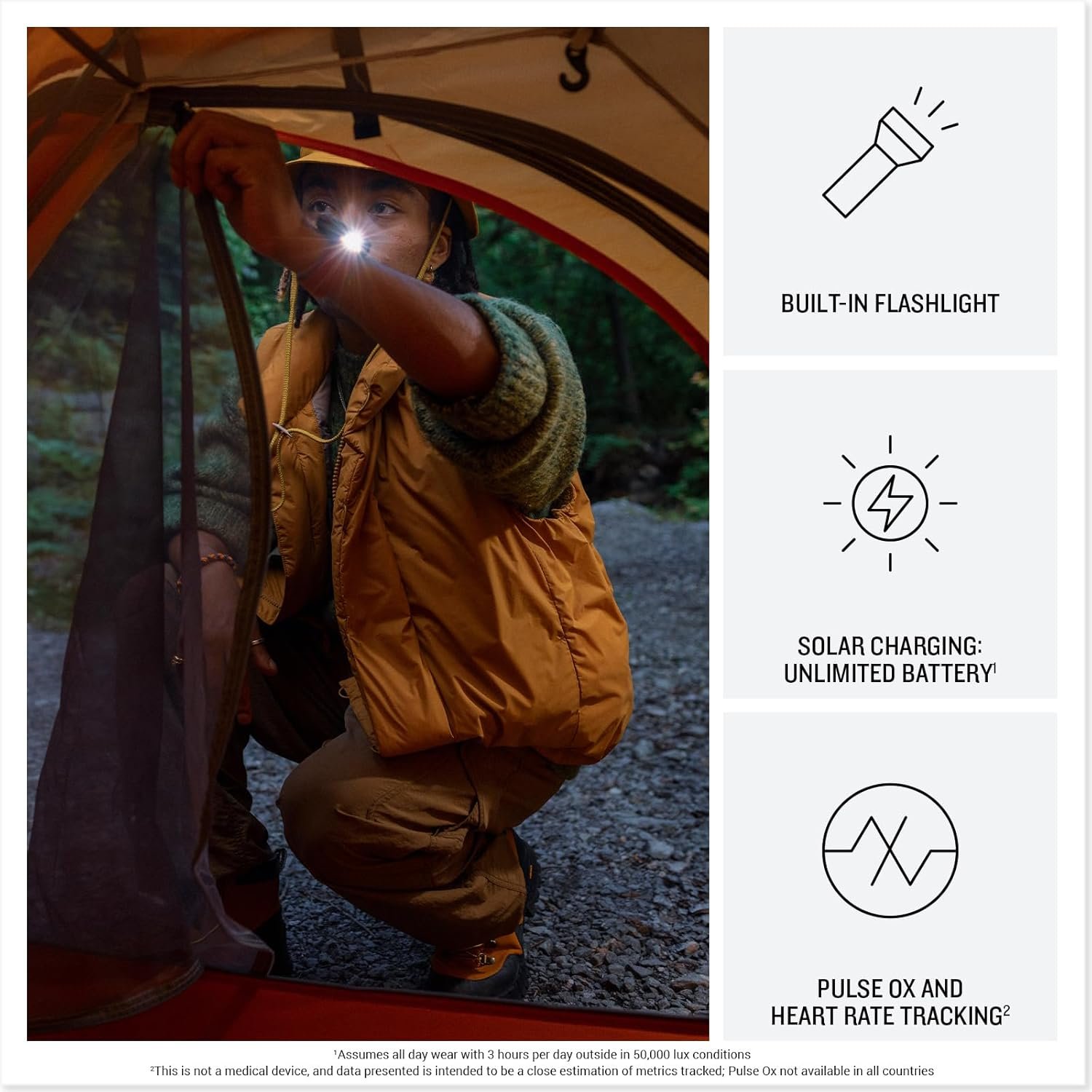 Make a bold statement with this rugged GPS smartwatch, featuring a 1.1” display with solar charging lens and unlimited battery life in smartwatch mode with solar charging (assumes all-day wear with 3 hours per day outside in 50,000 lux conditions)