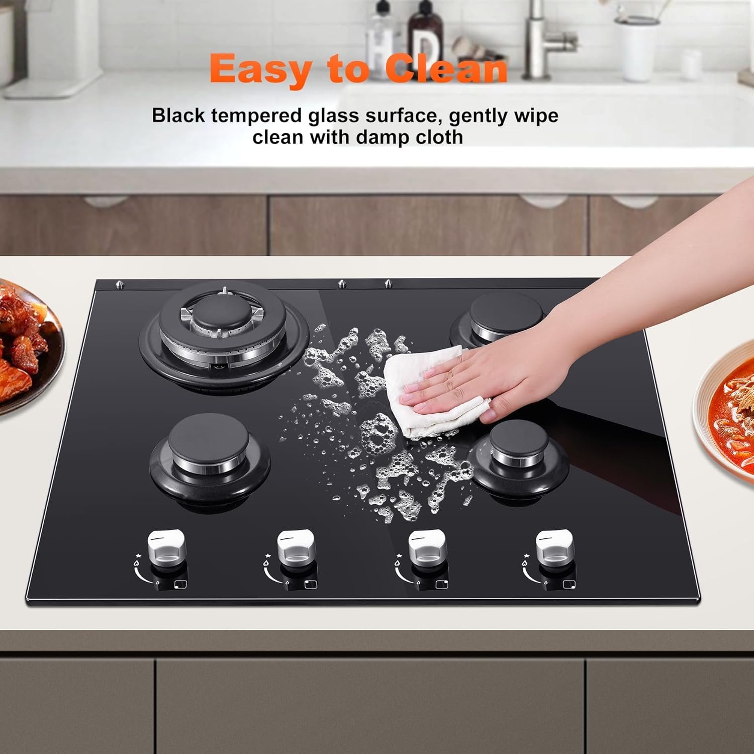 【Premium Quality and Easy to Clean】This gas stove top is made of 8mm thickened black tempered glass, high temperature and corrosion resistance and easy to clean. One-piece design prevents spilled liquid from seeping into the interior of the gas cooktop. Heavy cast iron grates support all kinds of heavy pots steadily. It is perfect for RVs, apartments, outdoor use.
