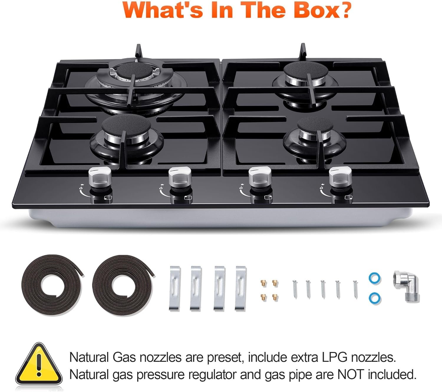 Extra LPG Nozzles are included in the package, but the natural gas pressure regulator and the gas pipe are NOT included.It is recommended that the gas stove top be installed and tested by professionals.Please tear off the film on the surface before using to avoid fire.