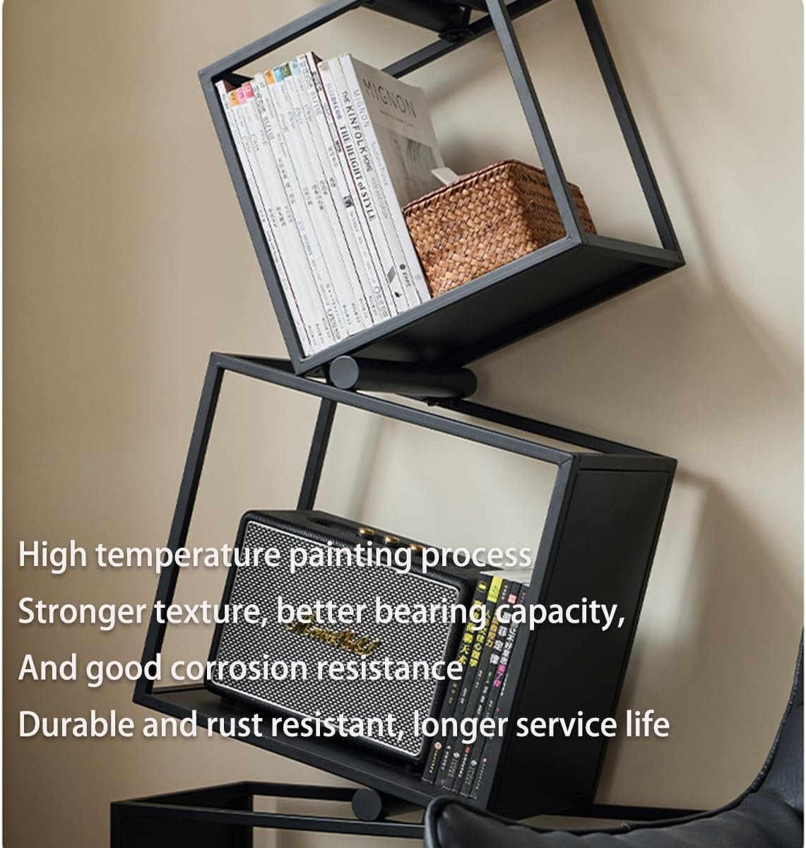 Our Unique Bookshelf showcases a cutting-edge irregular cubic structure, where each layer is thoughtfully stacked at varying angles. This avant-garde design not only adds a touch of modernity to any space but also creates a visually dynamic and harmonious form, setting it apart from traditional shelving units.