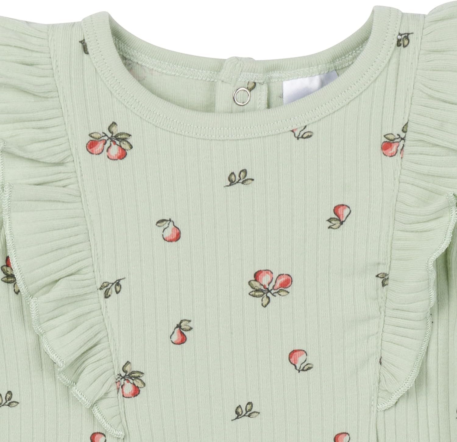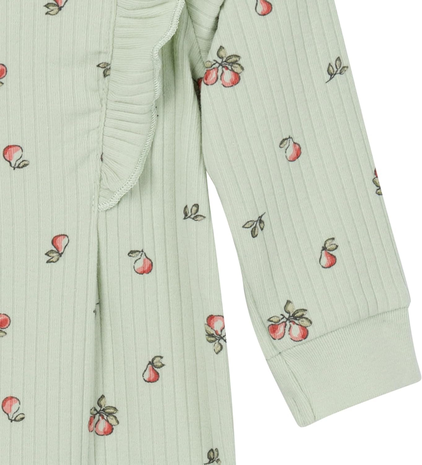 Crafted from soft drop needle cotton, our baby or toddler girl romper provides a gentle feel and flexible fit, keeping her cozy and content all day long. With convenient leg snaps, you can easily complete diaper changes without removing the entire piece. The rounded, ribbed neckline and rear snaps provide a comfortable yet secure fit, while the purl edge ruffles add a charming touch of flair. Perfectly adorable and great for all-day wear, this machine washable romper is easy to keep clean and ready to wear all season long.