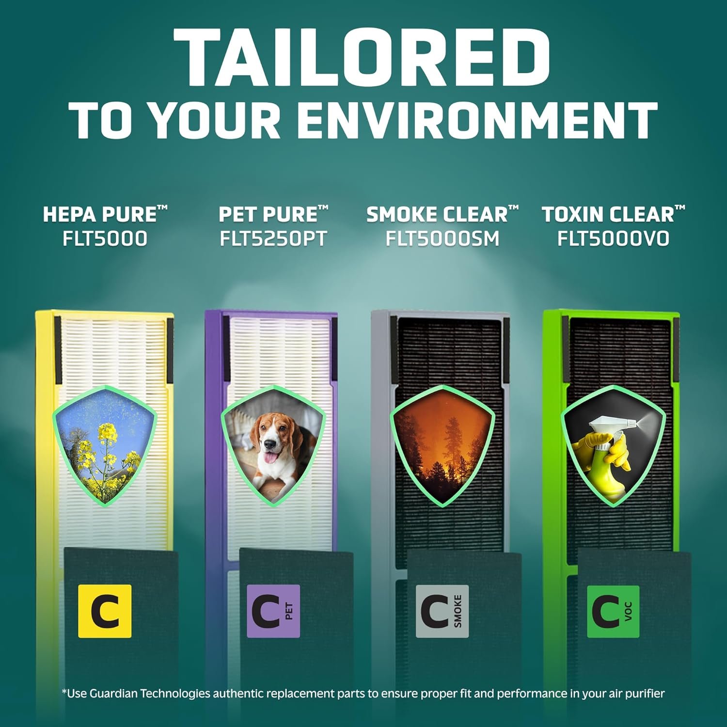 GermGuardian® FLT5000 HEPA GENUINE Replacement Filter C is a combination filter. It includes a HEPA filter that captures 99.97% of allergens as small as 0.1 microns. It also contains a pre-filter/activated carbon filter layer that captures odors from cooking, pets and smoking. It is recommended to use with the GermGuardian® AC5000E, AC5250PT, AC5300B, AC5350W, AC5350B, CDAP5500; PureGuardian® AP2800CA, Black+Decker™ Model BXAP250 and Lowe’s® Idlyis Model IAP-GG-125. The use of this genuine Guardian Technologies™ replacement part will maintain the product’s performance.