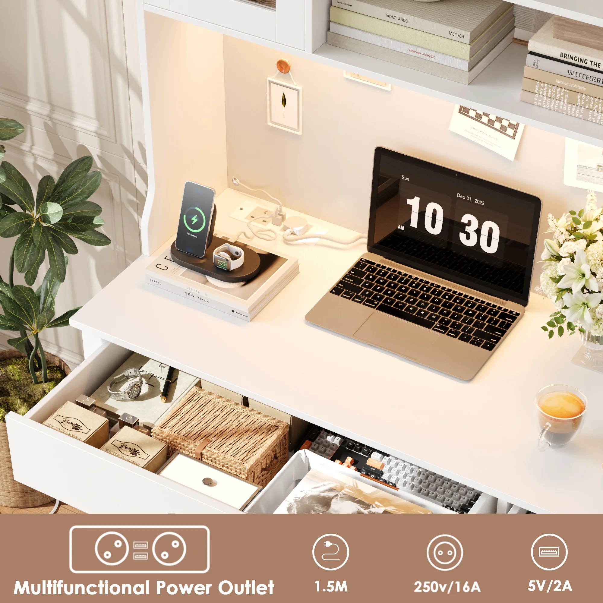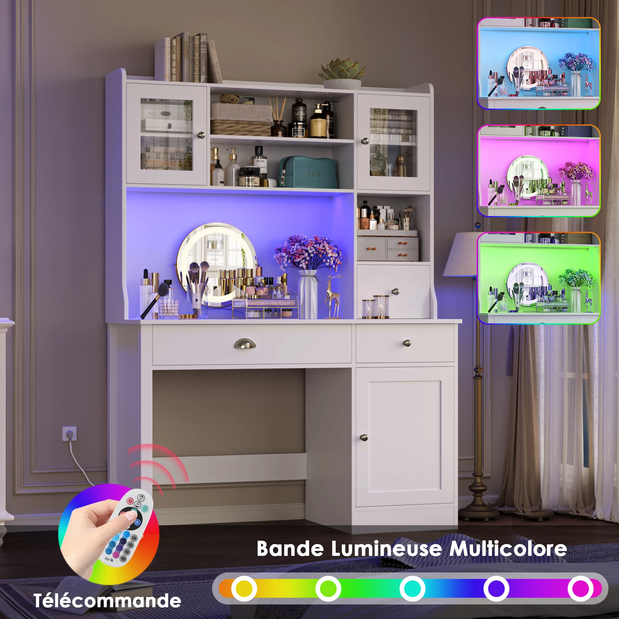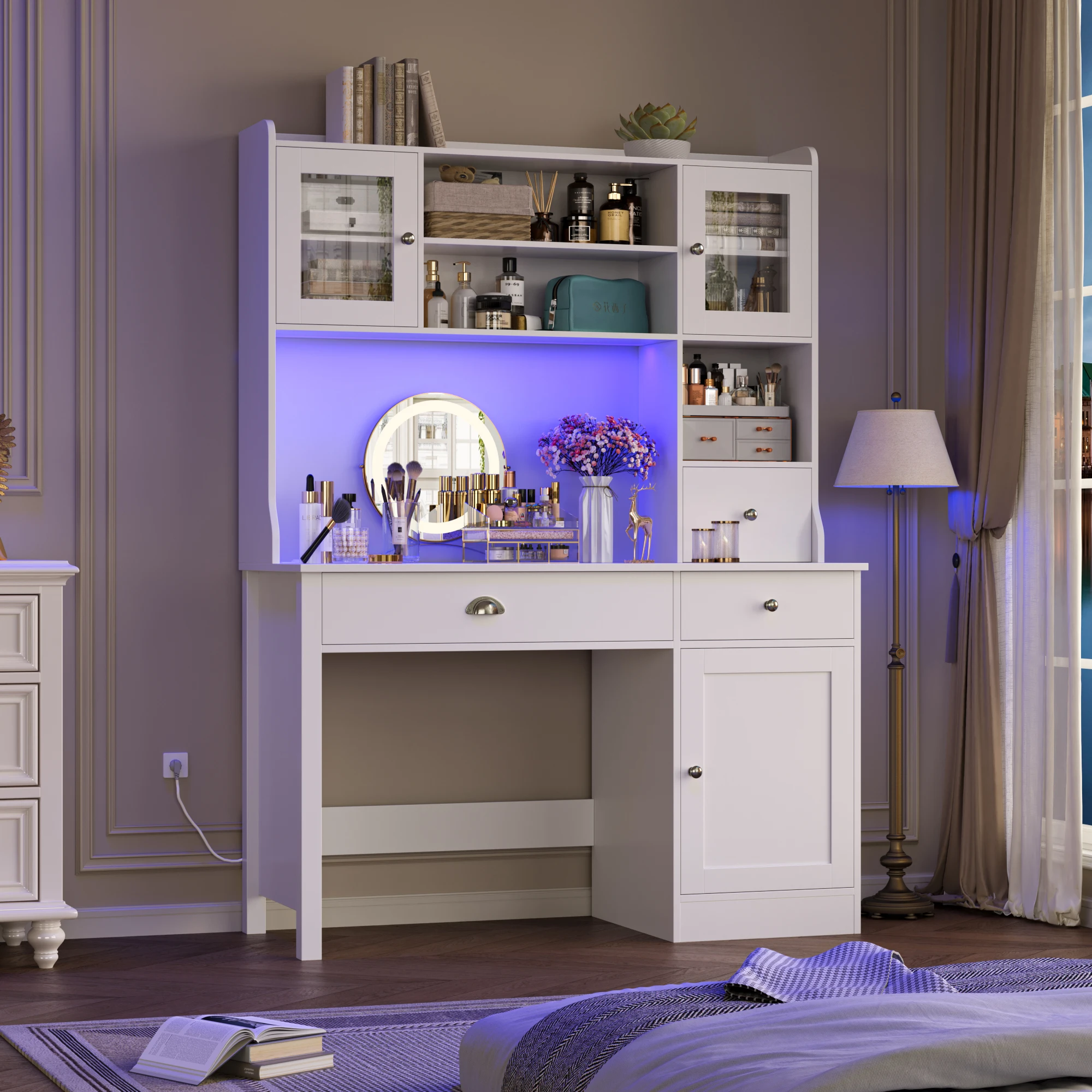 1 review for Getone Desk with LED White, computer table with drawers, dressing table table without mirror with 2 sockets 2 USB, 120x48x165cm