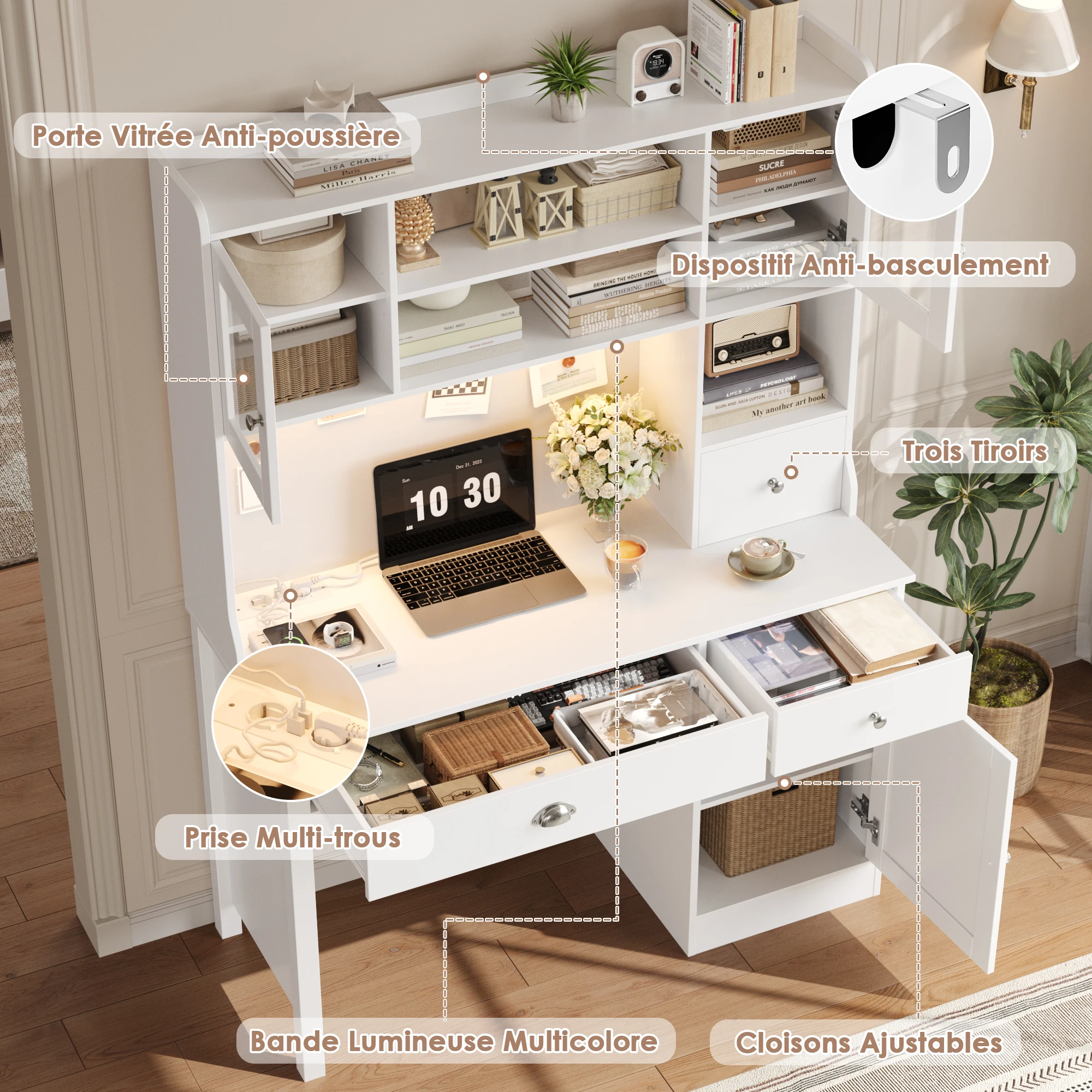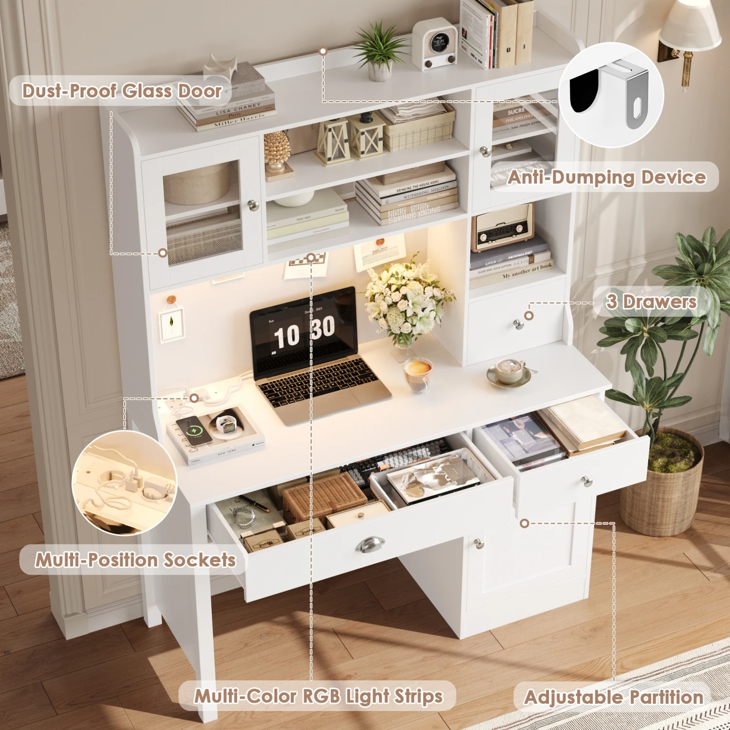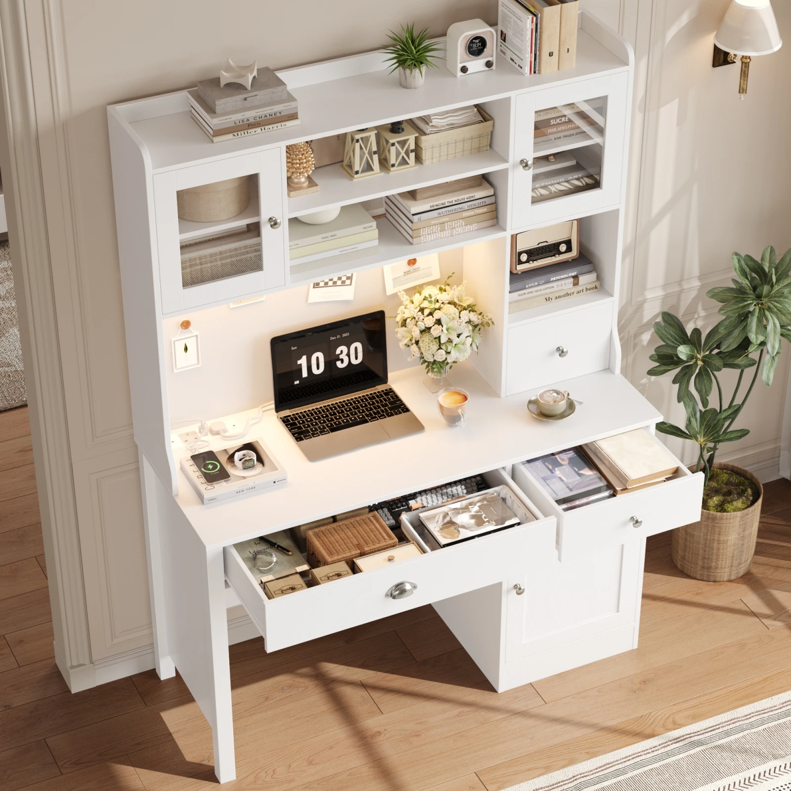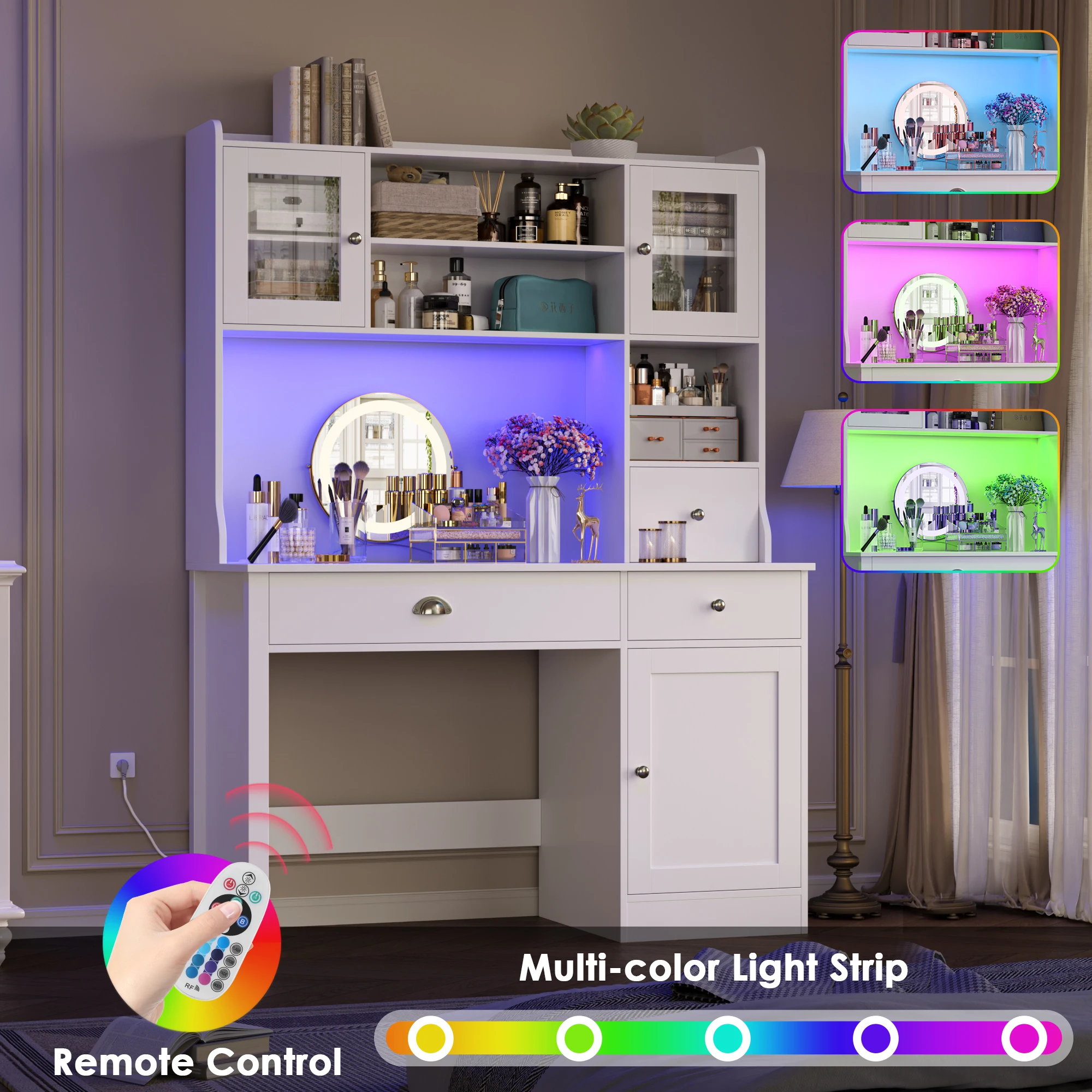 1 review for Getone Desk with LED White, computer table with drawers, dressing table table without mirror with 2 sockets 2 USB, 120x48x165cm