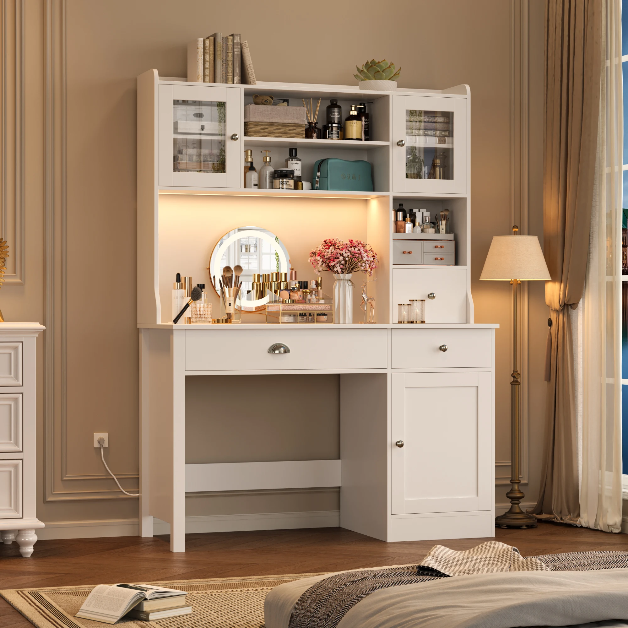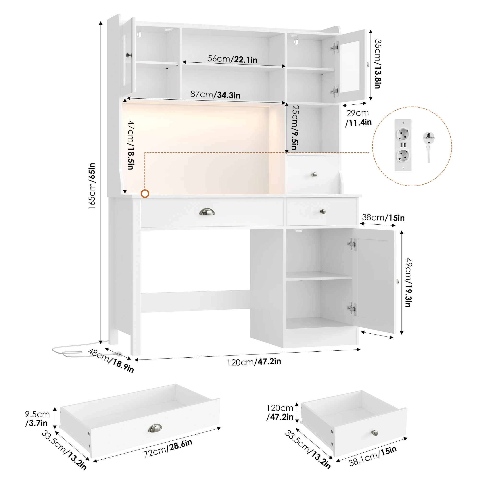Getone Desk with LED White, computer table with drawers, dressing table table without mirror with 2 sockets 2 USB, 120x48x165cm