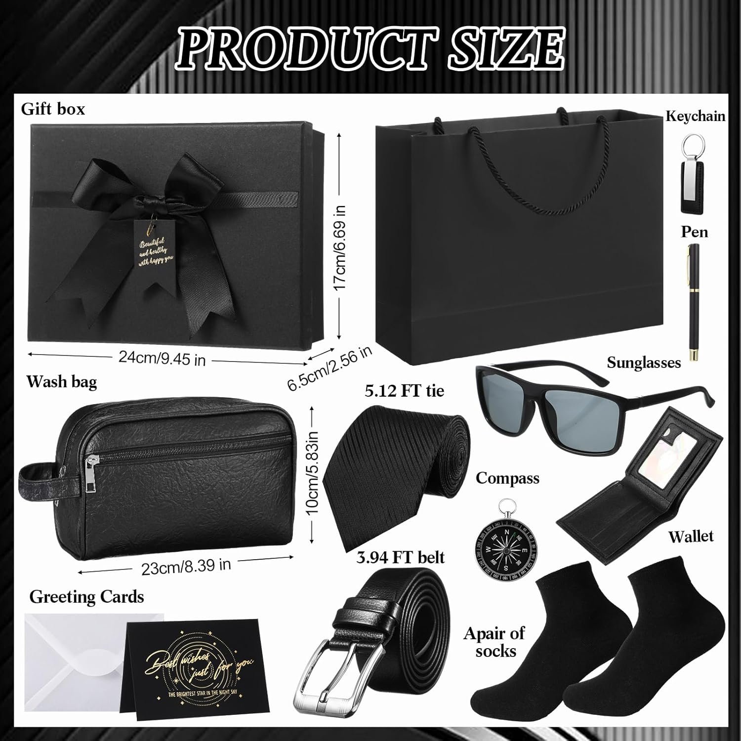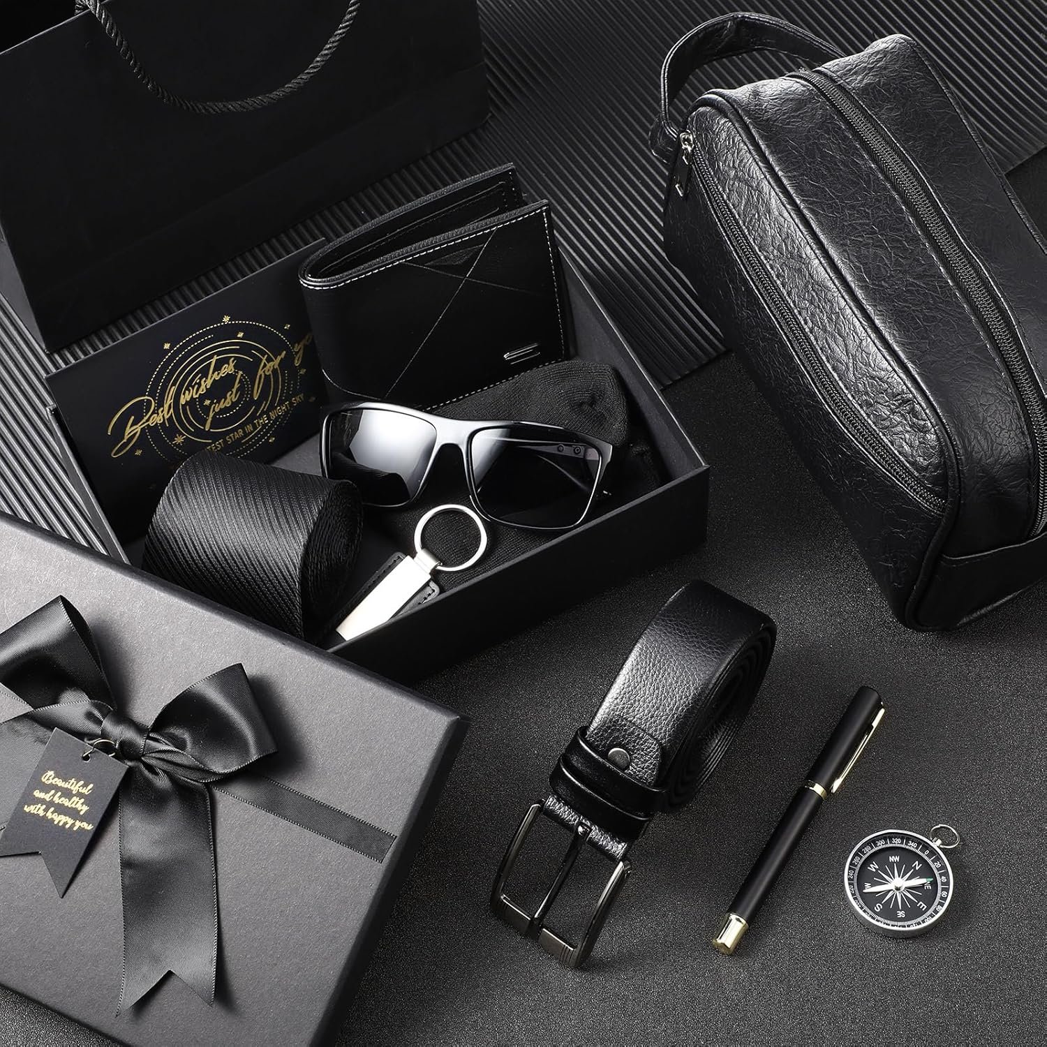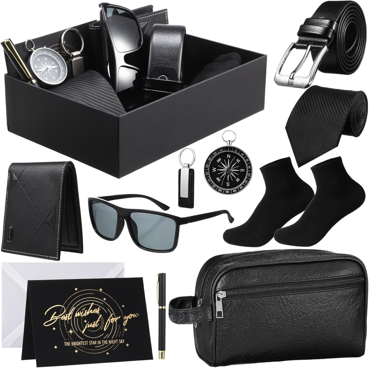 Geyoga 12 Pcs Men Birthdays Gift Set with Box for Men Dad Basket PU Leather Wallet Leather Toiletry Bag Tie Socks Belt Keychain Sunglasses Pen Compass Set