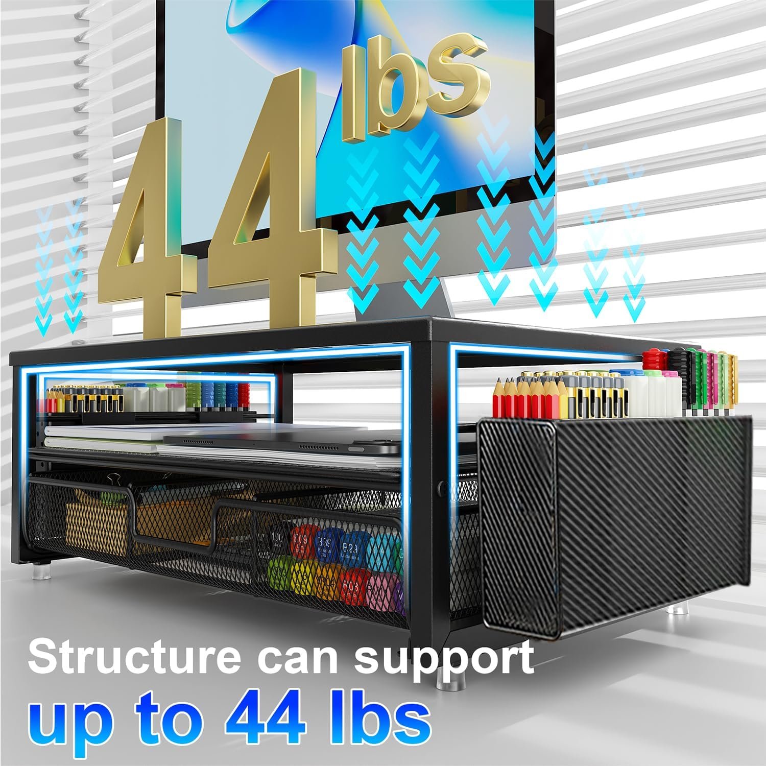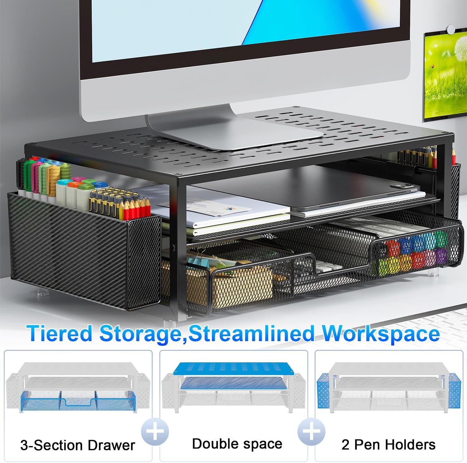 【Improved Work Efficiency】: The monitor riser comes with a sliding drawer and two pen holders. It accommodates various office desk items, saving space. It helps you quickly identify the contents of each compartment, doubling your work speed.