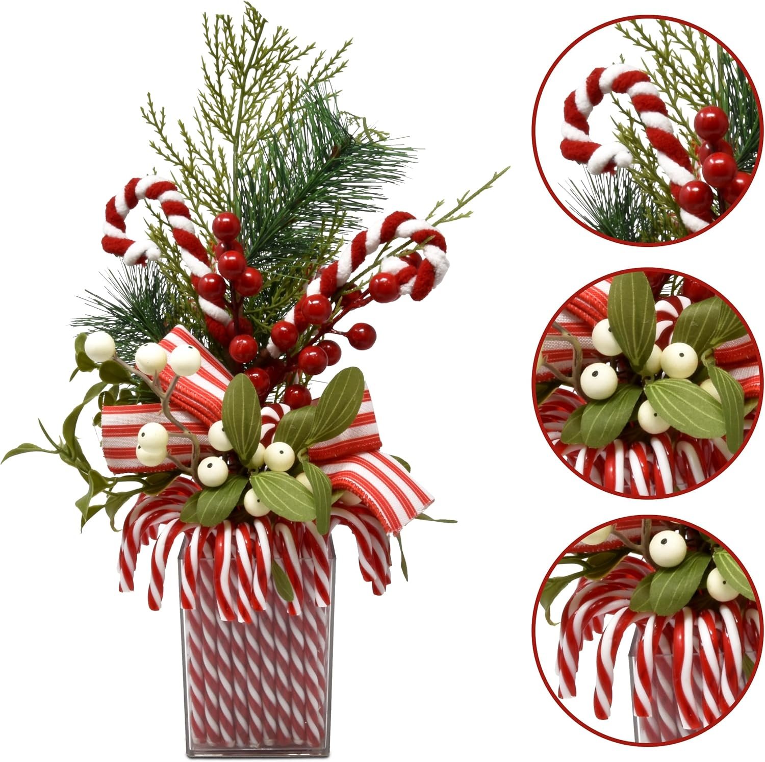 Large Christmas Artificial Plant is an adorable addition to your holiday decorations. Features: white berries, red berries, green pine, green leaves, red and white peppermint candy canes red and white striped bow. They are placed in a clear acrylic rectangular base that sits nicely.