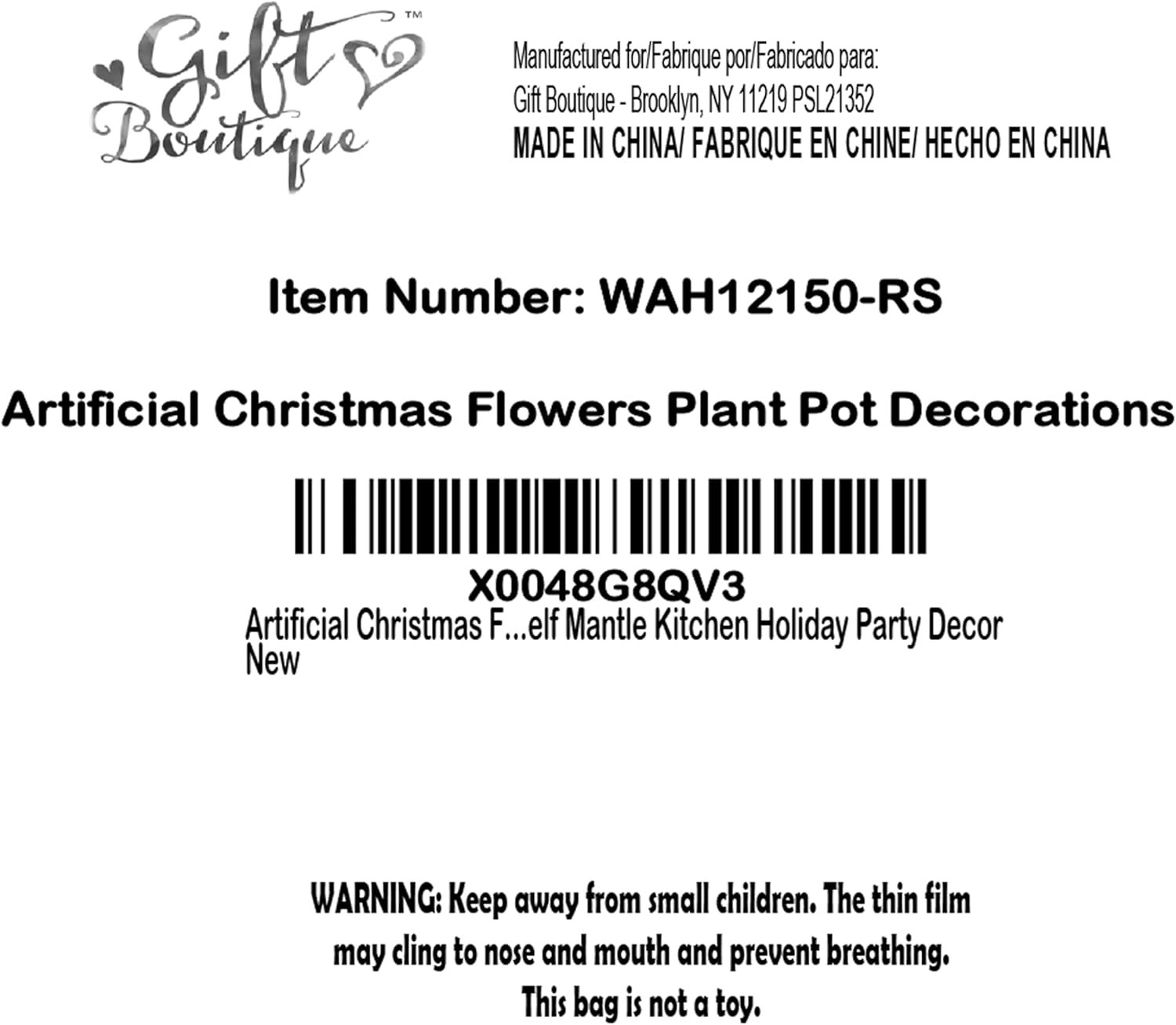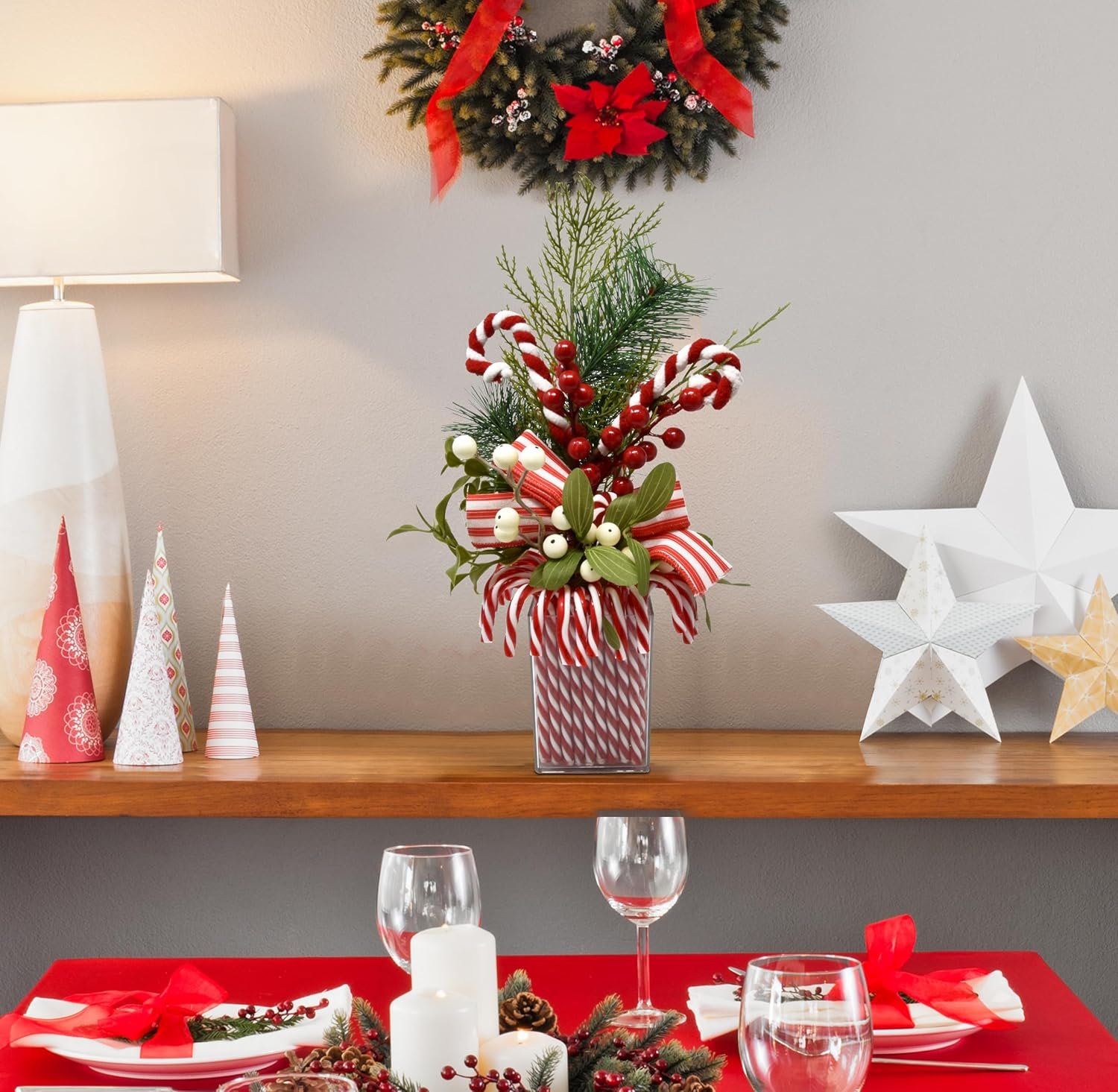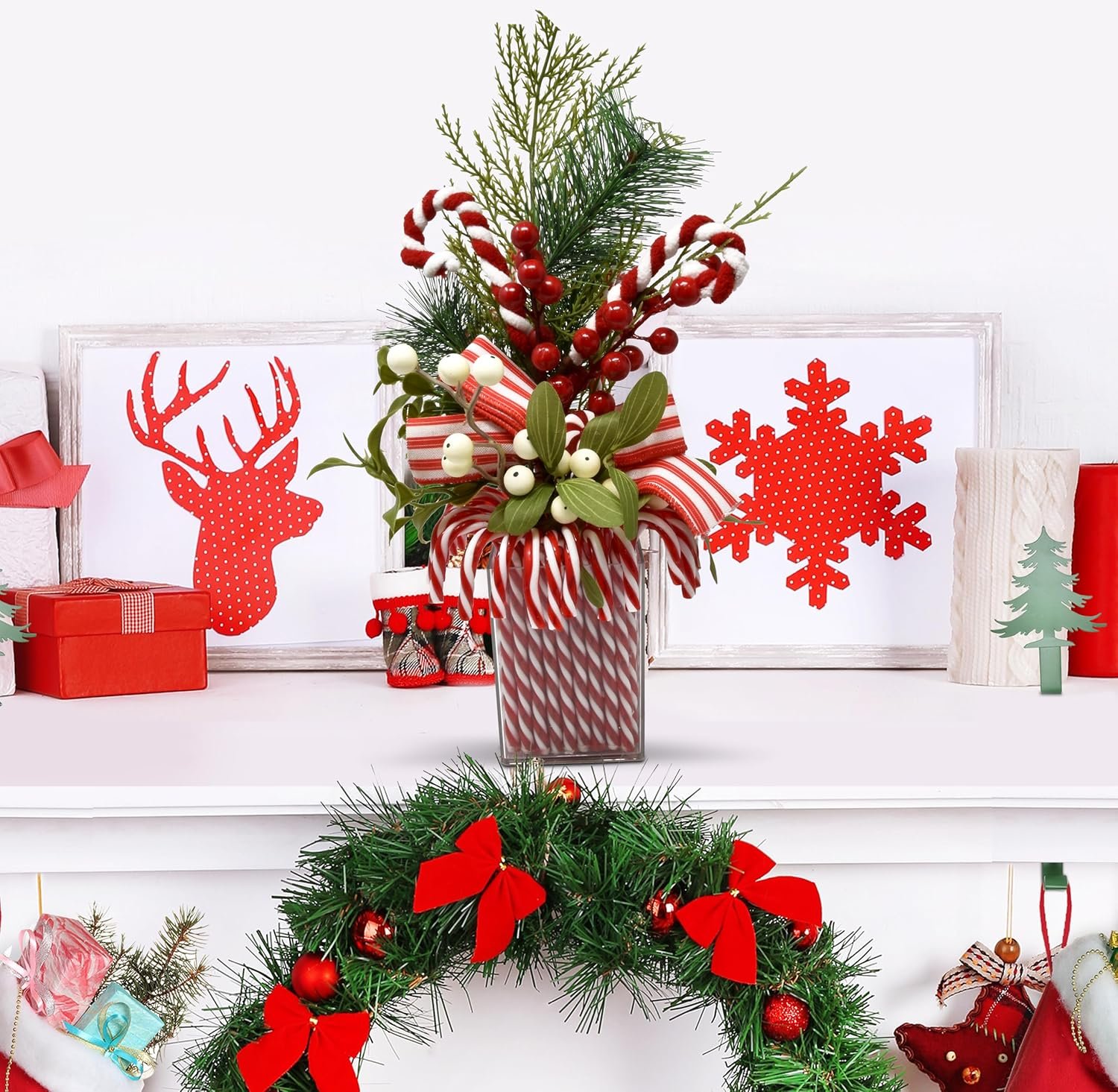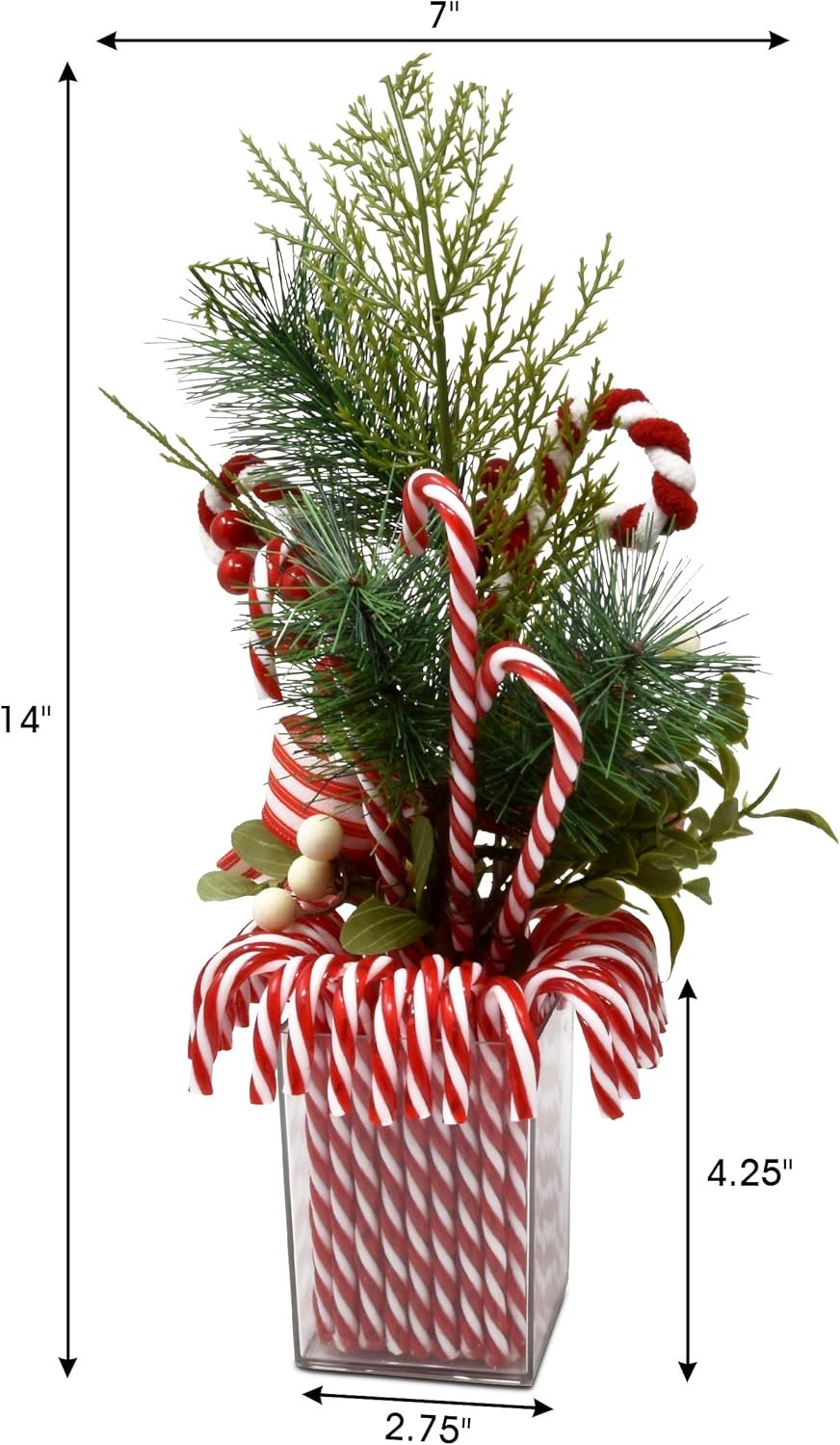 Large Christmas Artificial Plant is an adorable addition to your holiday decorations. Features: white berries, red berries, green pine, green leaves, red and white peppermint candy canes red and white striped bow. They are placed in a clear acrylic rectangular base that sits nicely. Our artificial Christmas floral arrangement for decoration is lifelike and real looking. Place it over your fireplace or on your side table, on stairs and entryways and let your holiday celebrations begin. Our artificial plant with candies is suitable for indoor and outdoor. Also perfect for produce market, Christmas tabletop decorations, seasonal bowl display, winter door wreath, dinner table centerpiece, wedding decoration, banquet place card settings, seasonal gifts, floral arrangements, photography props, etc. Our fake berry floral centerpieces and accessories are made of high-grade material, sturdy and durable, non-toxic and odorless, lightweight and everlasting, will never turn brown or perish. Ideal for table or fireplace mantel decorations! Dimensions are between 14″ h x 7″ w. Square base measures 2.75″ w x 4.25″ h. Just the right size to make a statement at your Christmas dinner and enhance and complete the decor.