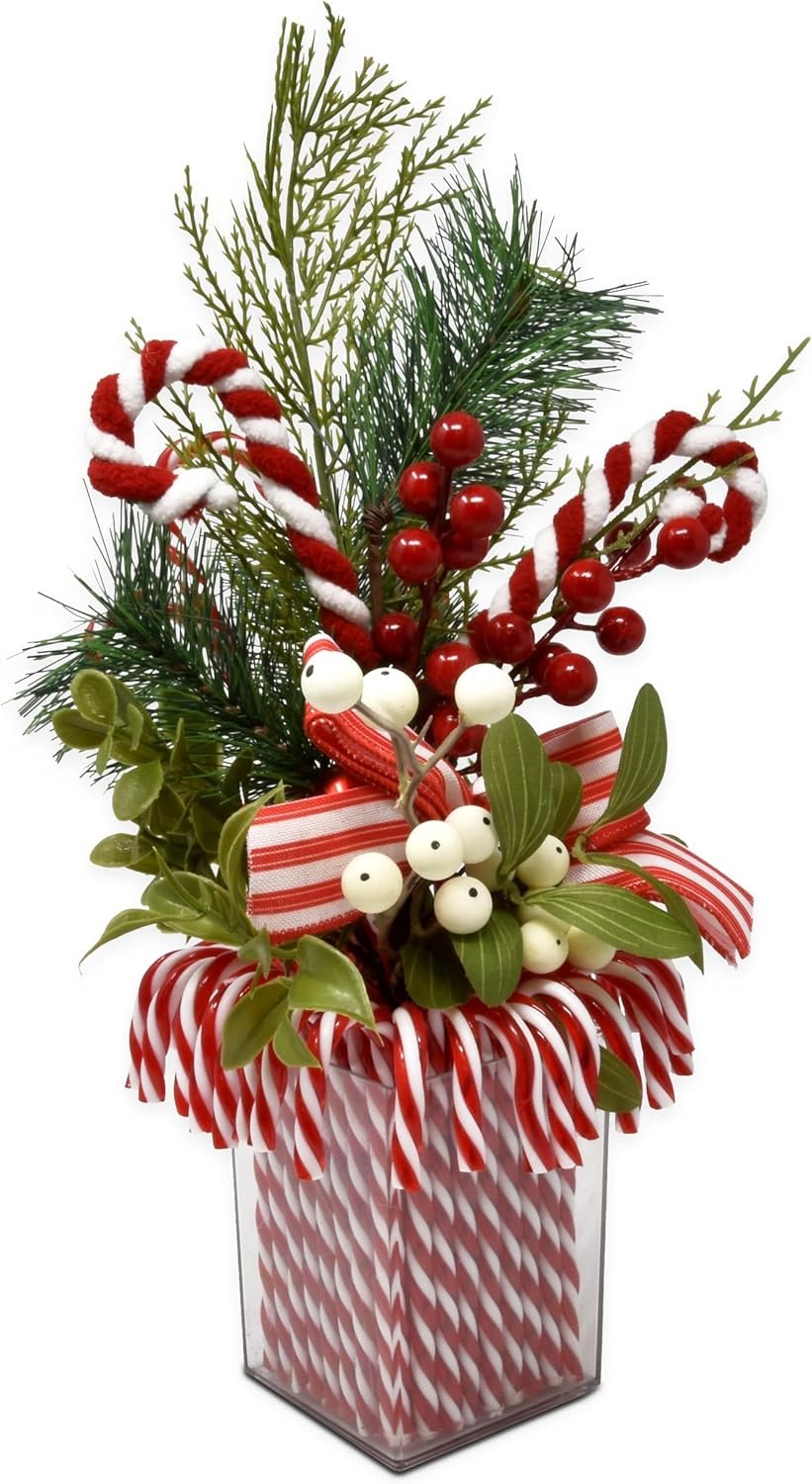 Gift Boutique – Artificial Christmas Flowers Plant Pot Decorations Xmas Floral Tabletop Centerpiece Arrangement 14″ Red & White Peppermint Candy Canes Berries Pine for Holiday Party Decor