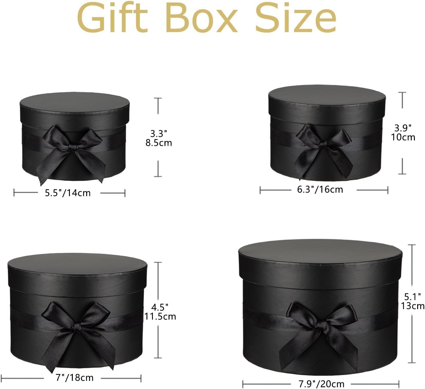 Ideal Size: The set of 4 gift boxes is designed in various sizes to meet your different packaging needs. You can choose the right box according to the size of the item. Extra large gift box: 7.9″ L * 7.9″ W * 5″ H; Big gift box: 7″ L * 7″ W * 4.5″ H; Medium gift box: 6.5″ L * 6.5″ W * 4″ H; Small gift box: 5.5″ L * 5.5″ W * 3.3″ H.