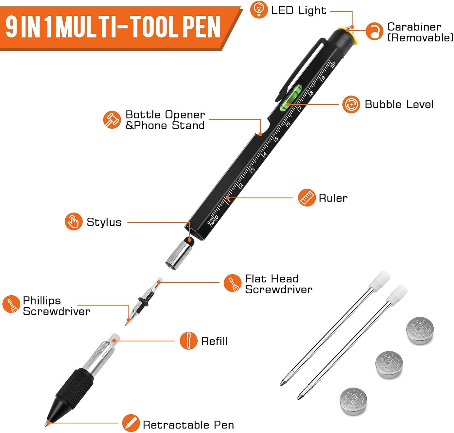 MULTIPLE USE FUNCTIONS: This multi tool pen has 9 useful functions, including ballpoint pen, flat head screwdriver, Phillips screwdriver, stylus, bottle opener, phone holder, bubble level, ruler and LED light. It is a very cool tool for men dad husband to daily use, especially suitable for Fathers Day Christmas stocking stuffers for men adults husband as an unique gift.